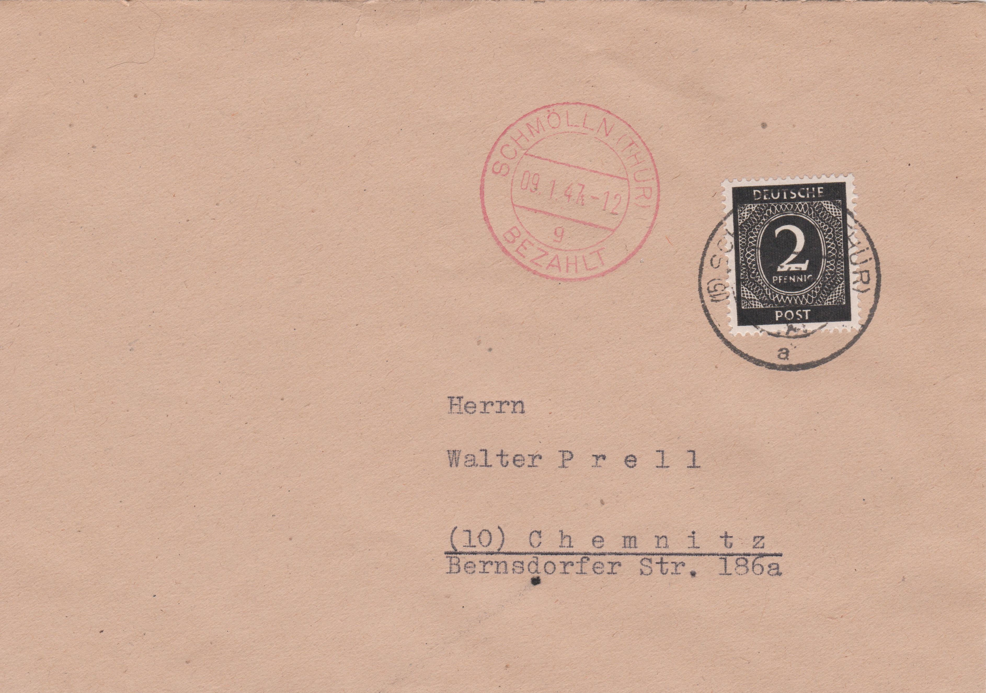 Dieser Brief, adressiert nach "(10) Chemnitz", wurde am 09.01.1947 um 12 Uhr in "(15) SCHMÖLN (THÜR)", frankiert mit einem Postwertzeichen der Wertstufe 2 Pf der Dauerserie Kontrollrat Sechenswürdigkeiten am Postschalter aufgegeben:
