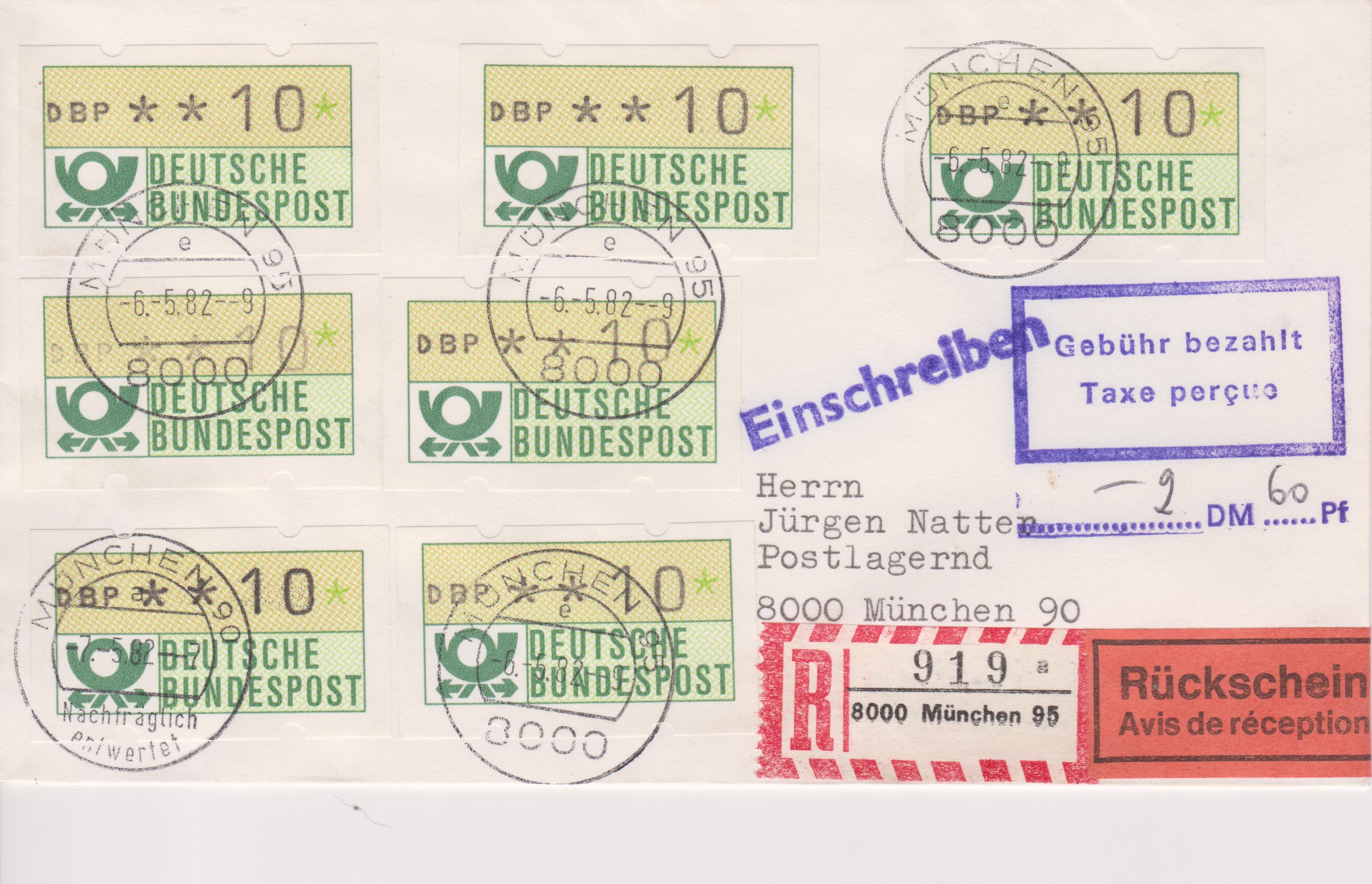 Dieser Brief per Einschreiben mit Rückschein wurde mit sieben Automatenmarken der Wertstufe 10 Pf frankiert in München am Postschalter eingeliefert: