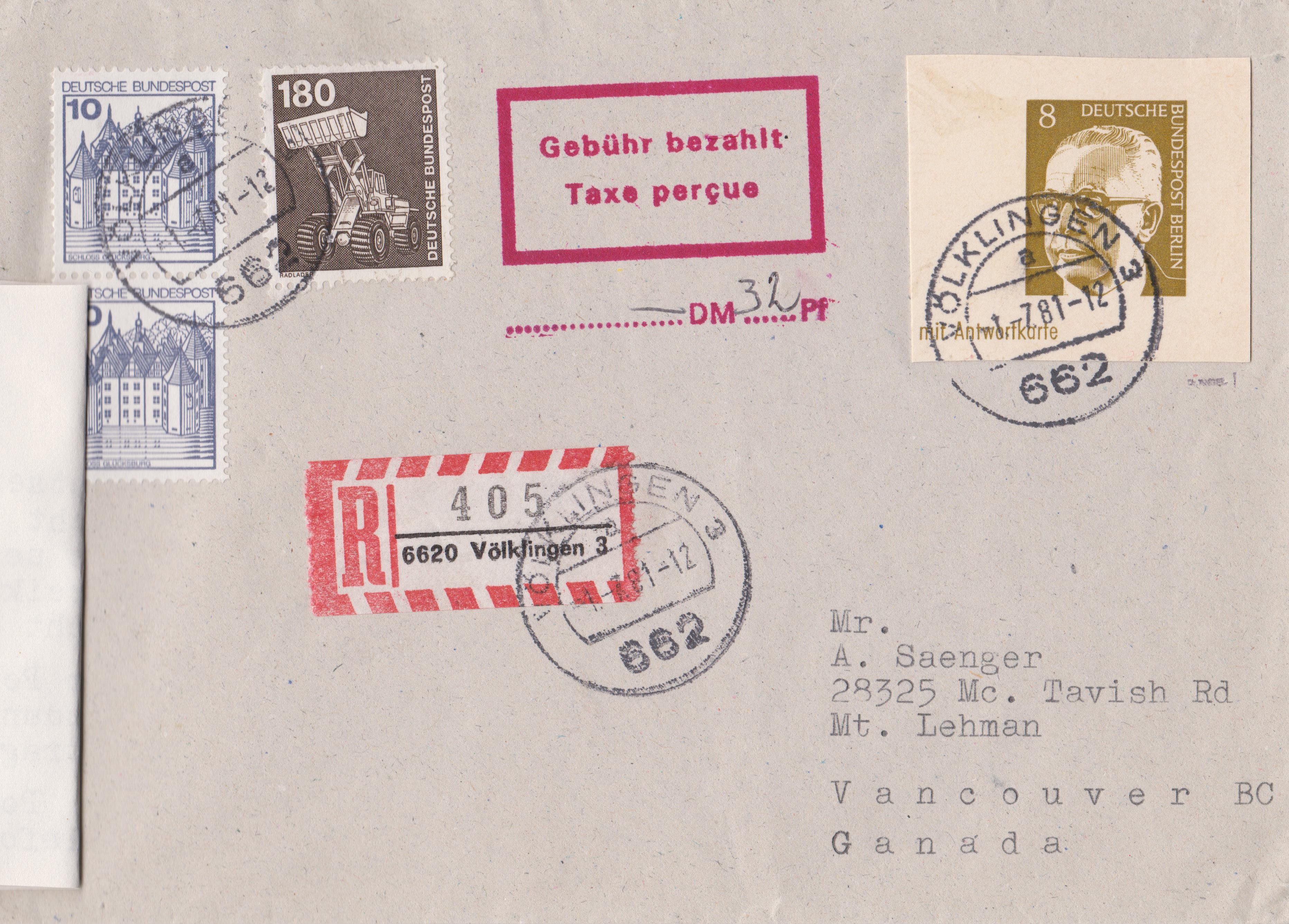 Brief per Einschreiben, adressiert nach "Vancouver Canada", aufgegeben am 01.07.1981 in "6620 VÖLKLINGEN 3", Portostufe 240 Pf, dargestellt als Mischfrankatur untr Verwendung eines Ganzsachenausschnitts "8 Pf Berlin" der Dauerserie Heinemann.