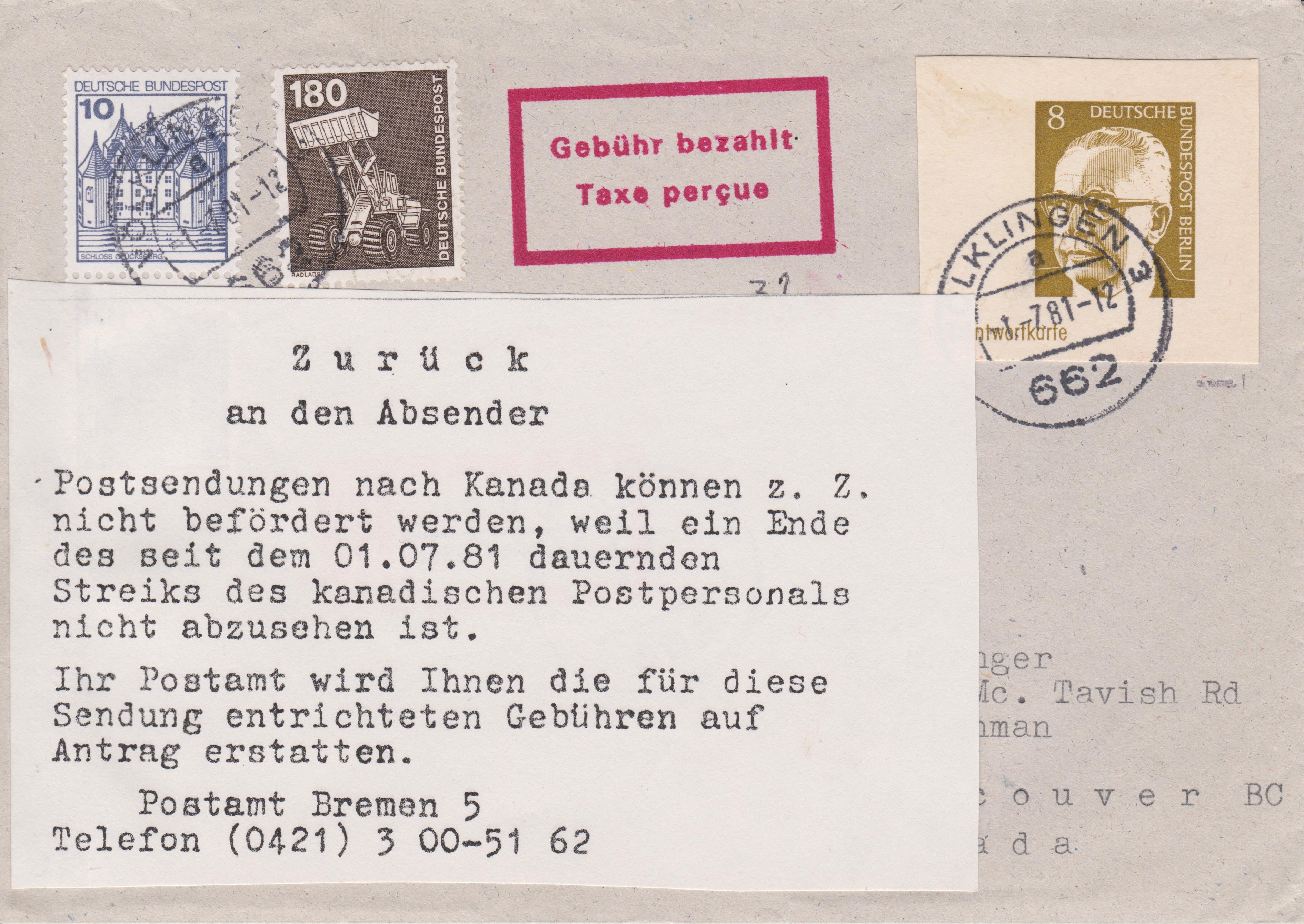 Aufgrund eines "Streiks des kanadischen Postpersonals" ab dem 01.07.1981 wurde dieser Beleg mit einem Hinweiszettel "Zurück an den Absender" versehen und ging an den Absender zurück: