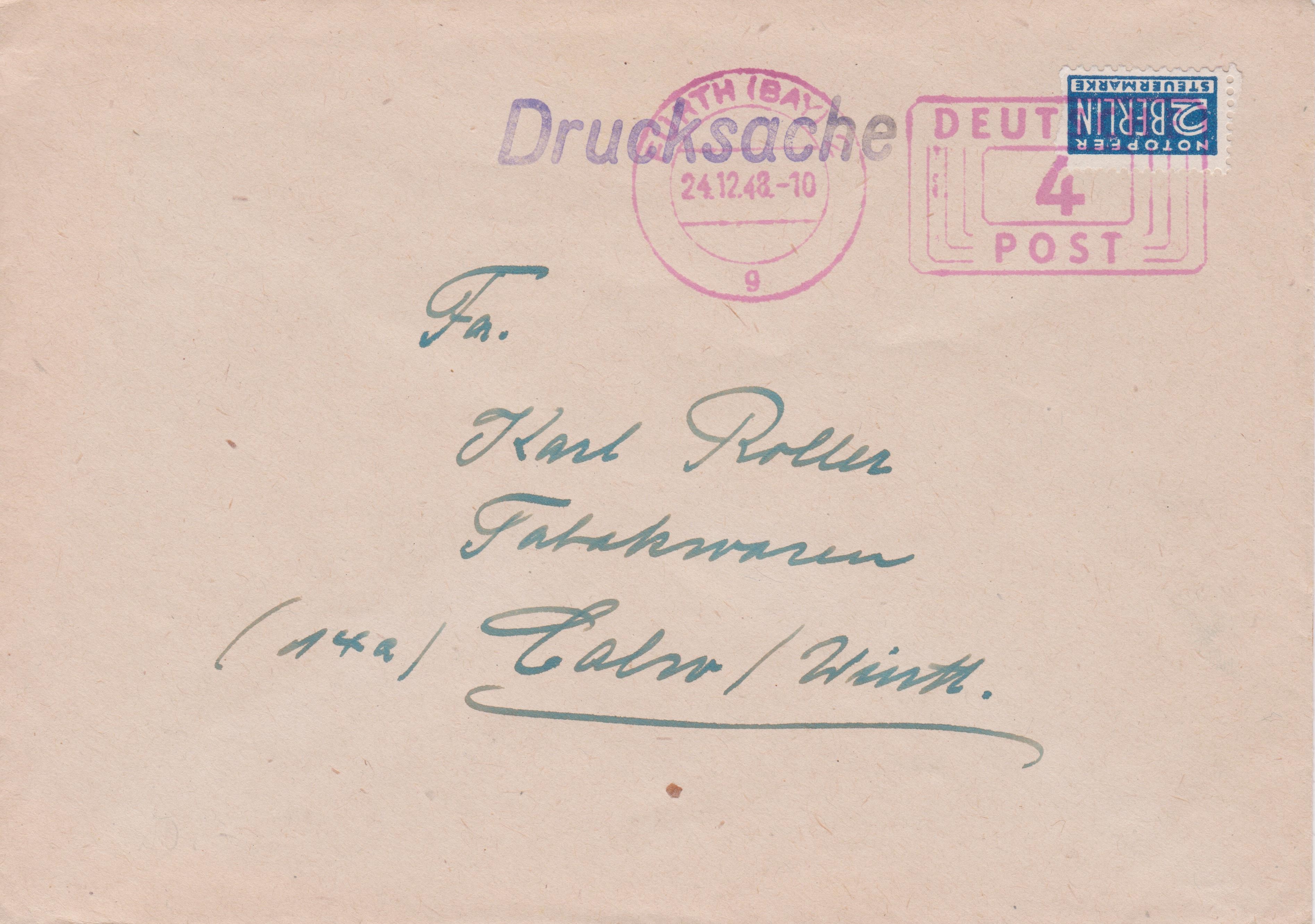 Hier ein solcher Beleg, aufgegeben in FÜRTH am 24.12.1948 (= Heiligabend!):