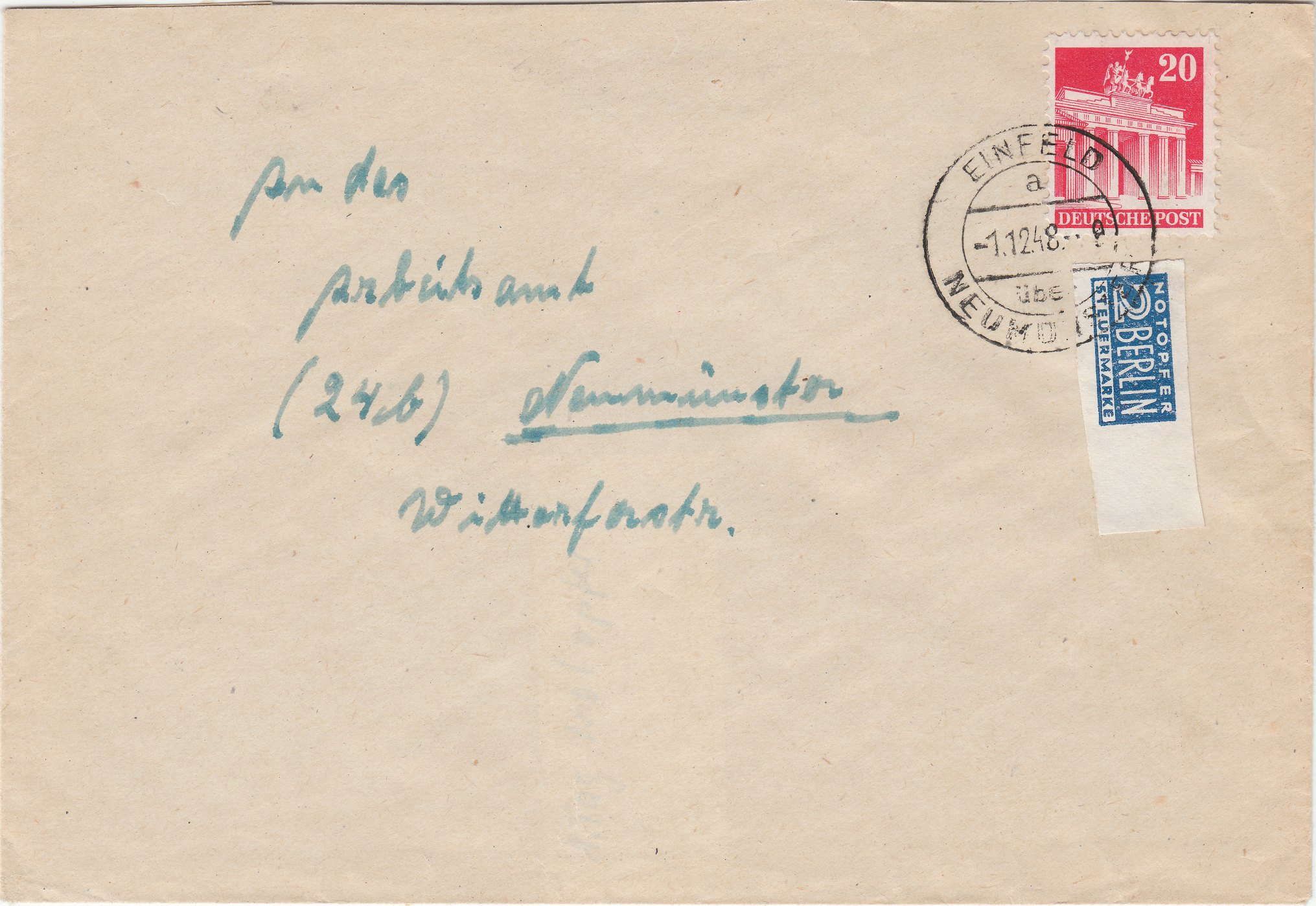 Hier ein Brief adressiert nach Neumünster, aufgegeben am 01.12.1948 in "EINFELD über NEUMÜNSTER", der den ersten Verwendungstag der Notopfermarke dokumentiert: