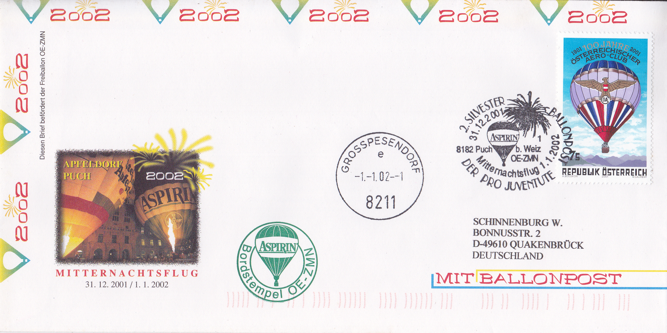 Dieser Brief wurde am 31.12.2001 in Puch bei Weiz zur 2. Silvester Ballonpostbeförderung (Mitternachtsflug) der Österreichischen Pro Juventute mit dem Freiballon OE-ZMN aufgegeben. Er erhielt den Sonderstempel aus Puch bei Weiz Mit der Kennziffer "1" zu diesem Mitternachtsflug und wurde mit dem Freiballon OE-ZMN befördert. Der Brief erhielt noch einen Tagesstempel vom 1.1.2002 aus Grosspesendorf und einen Bordstempel. Ein ähnlicher Brief wurde bereits früher mit dem Sonderstempel aus Puch mit der Kennziffer "2".