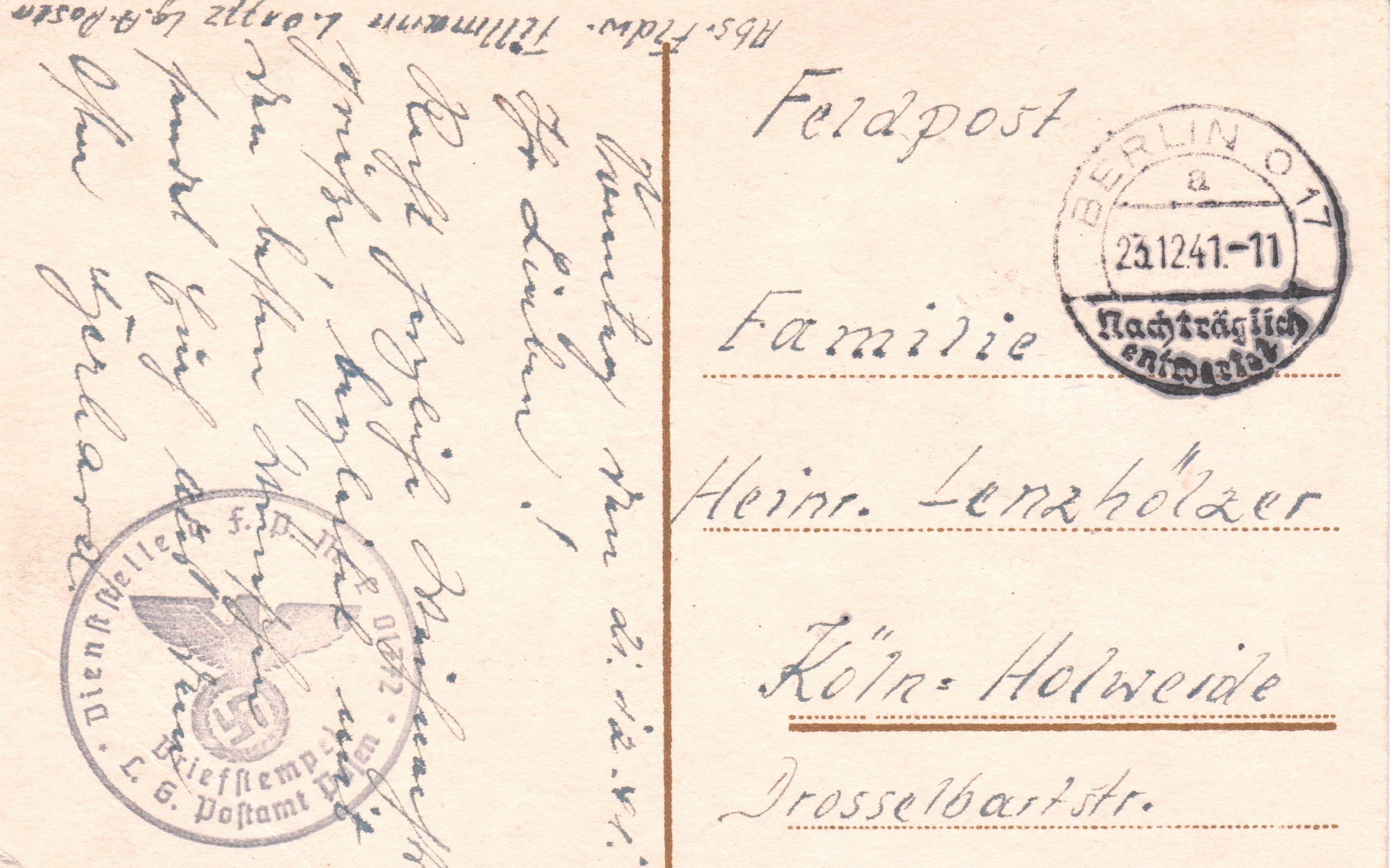 Die nach "Köln-Holweide" adressierte Sendung lief über BERLIN O 17, wo am 23.12.1941 um 11 Uhr ein Handstempel "Nachträglich entwertet" als Durchlaufstempel abgeschlagen wurde: