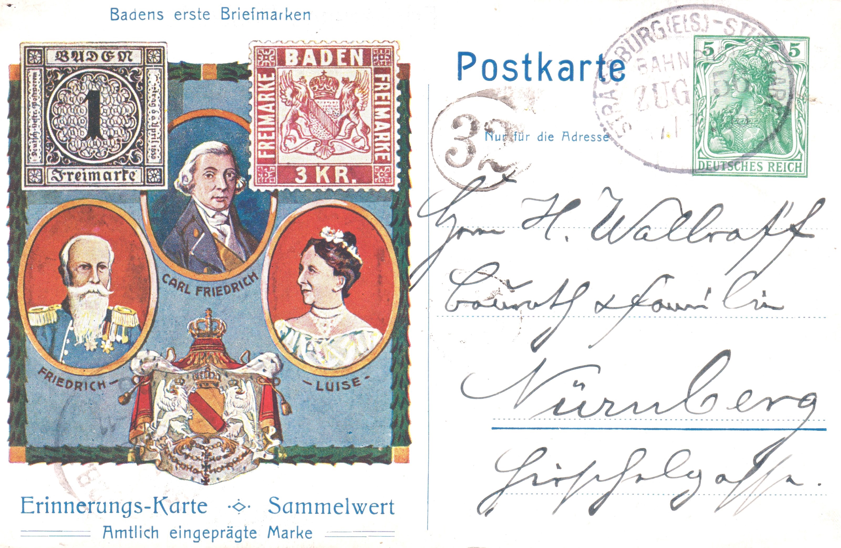 Postkarte, adressiert nach Nürnberg, aufgegeben per BAHNPOST ZUG 56 STRASSBURG - STUTTGART: