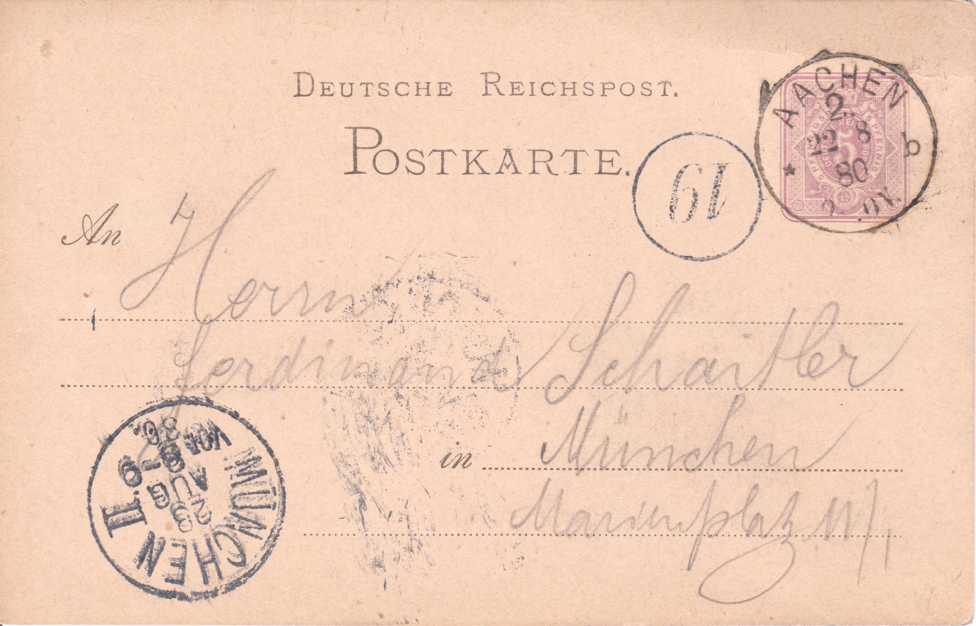 Postkarte, aufgegeben am 22.08.1880 in AACHEN, adressiert nach München: