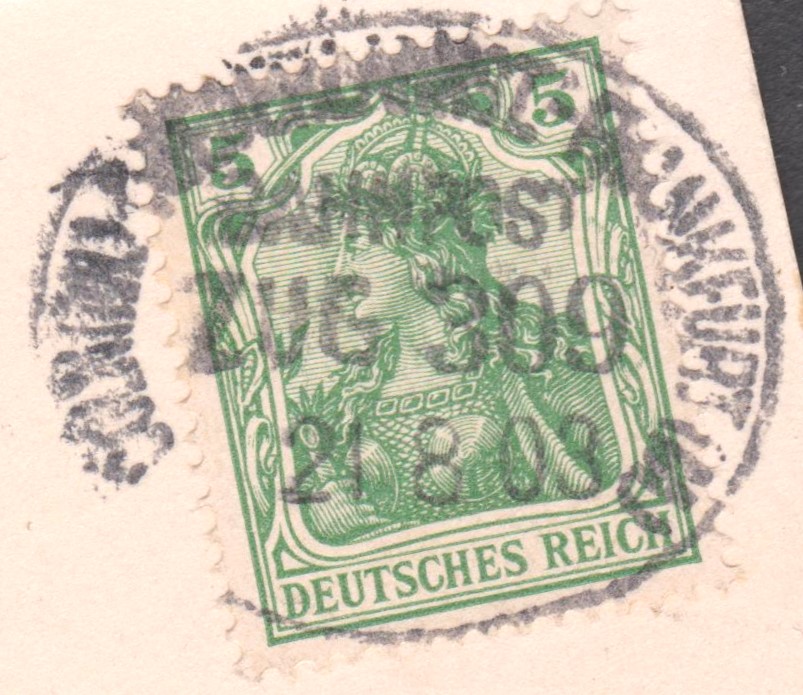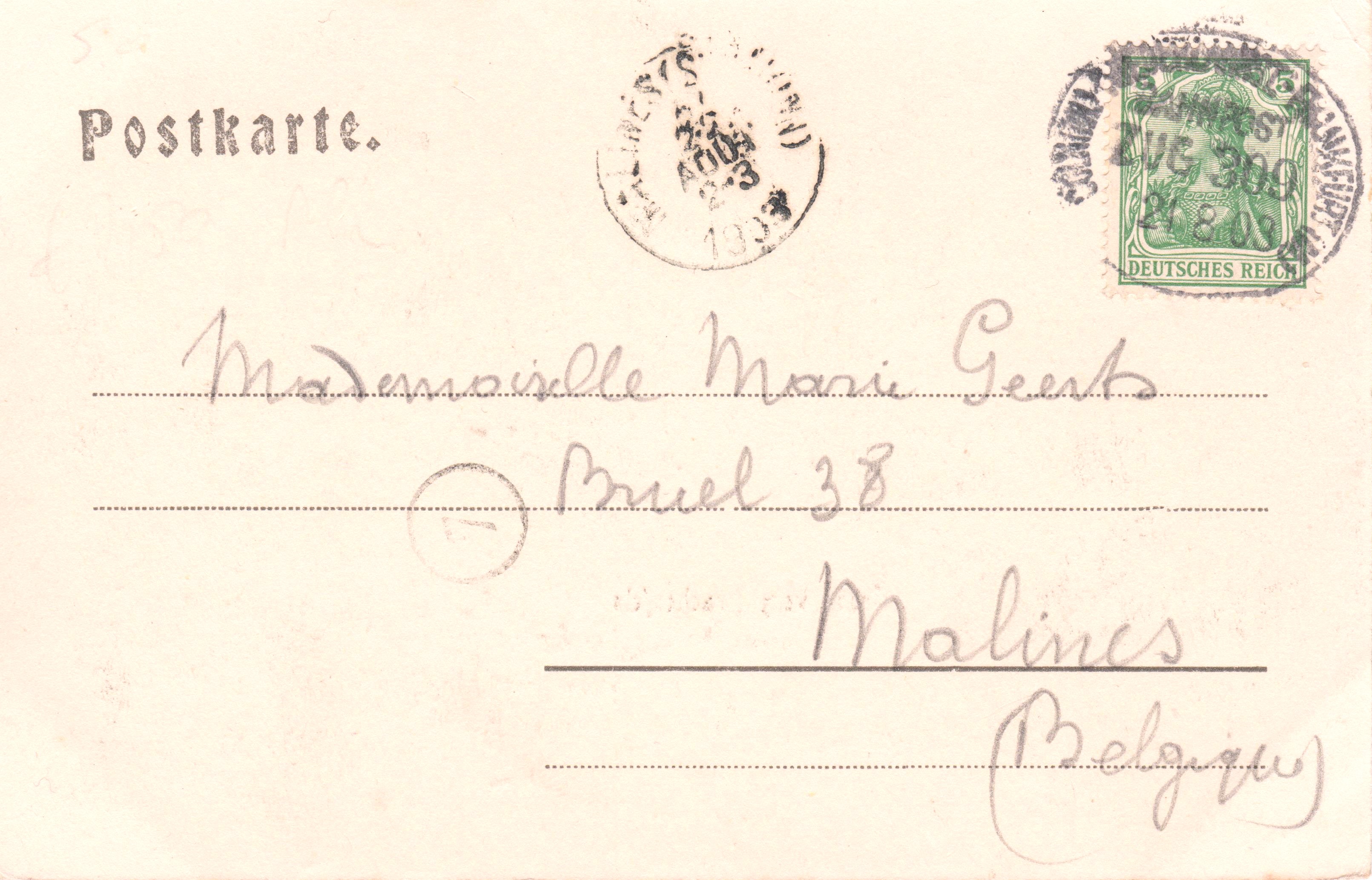 Am 22 AOU (= August) 1903 kam die Postkarte an ihrem Bestimmungsort an und wurde vom Zusteller "7" der Empfängerin zugestellt: