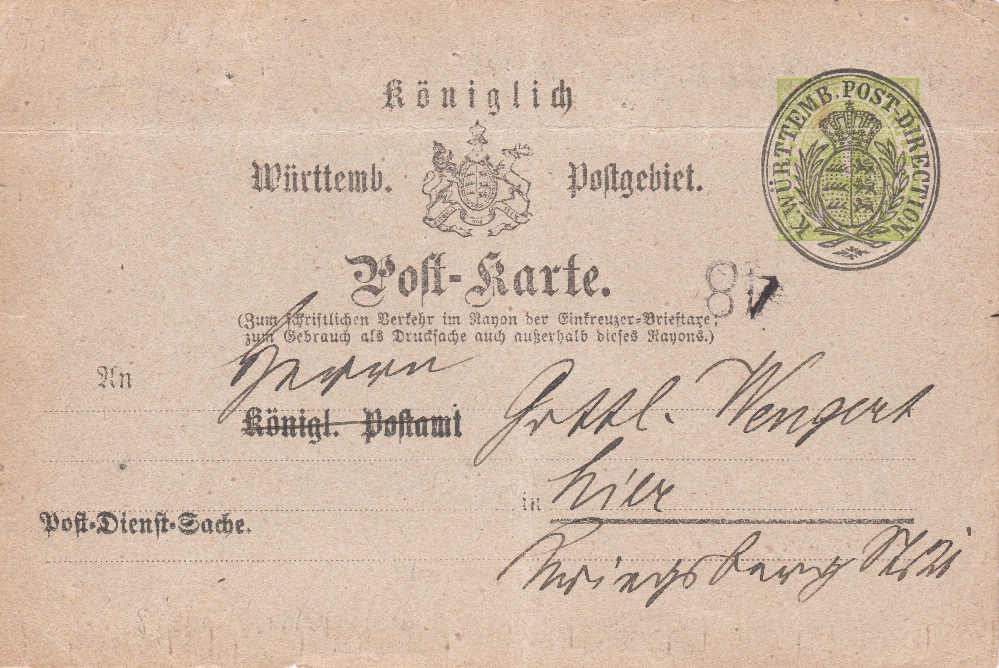 Postkarte vom 10.10.1903 mit Aufgabestempel "HEILBRONN ZWEIGPOSTSTELLE 1", Ankunftstempel "STUTTGART No. 1 B 5" sowie Zustellerstempel "82":