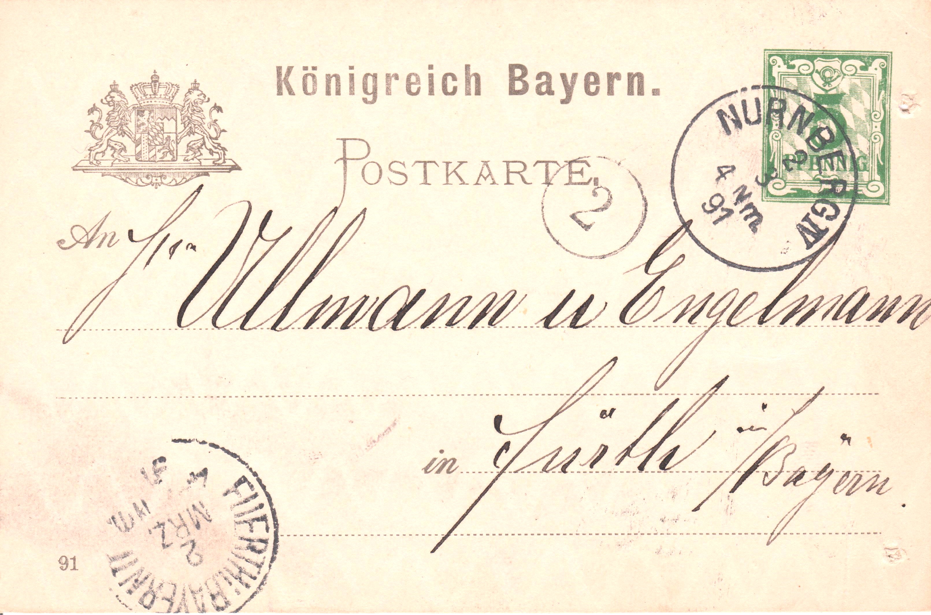 Postkarte vom 02.03.1891 mit Aufgabestempel "NÜRNBERG IV", Ankunftstempel "FÜRTH" sowie Zustellerstempel "2":