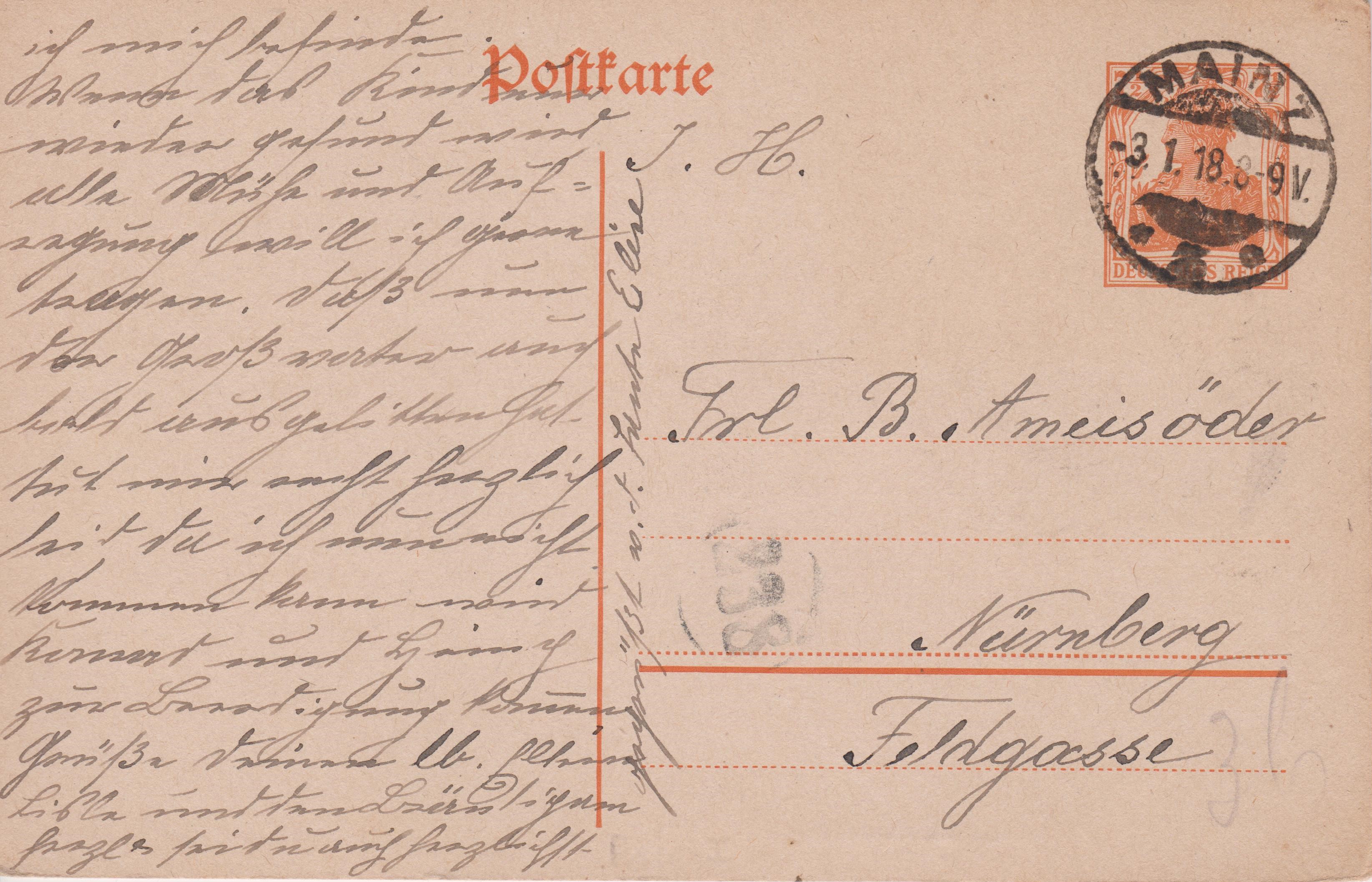 Diese nach Nürnberg adressierte Ganzsache mit eingedrucktem Postwertzeichen der Dauerserie Germania zu 7 1/2 Pf, Deutsches Reich P 110 I, wurde am 03.01.1918 in MAINZ aufgegeben:
