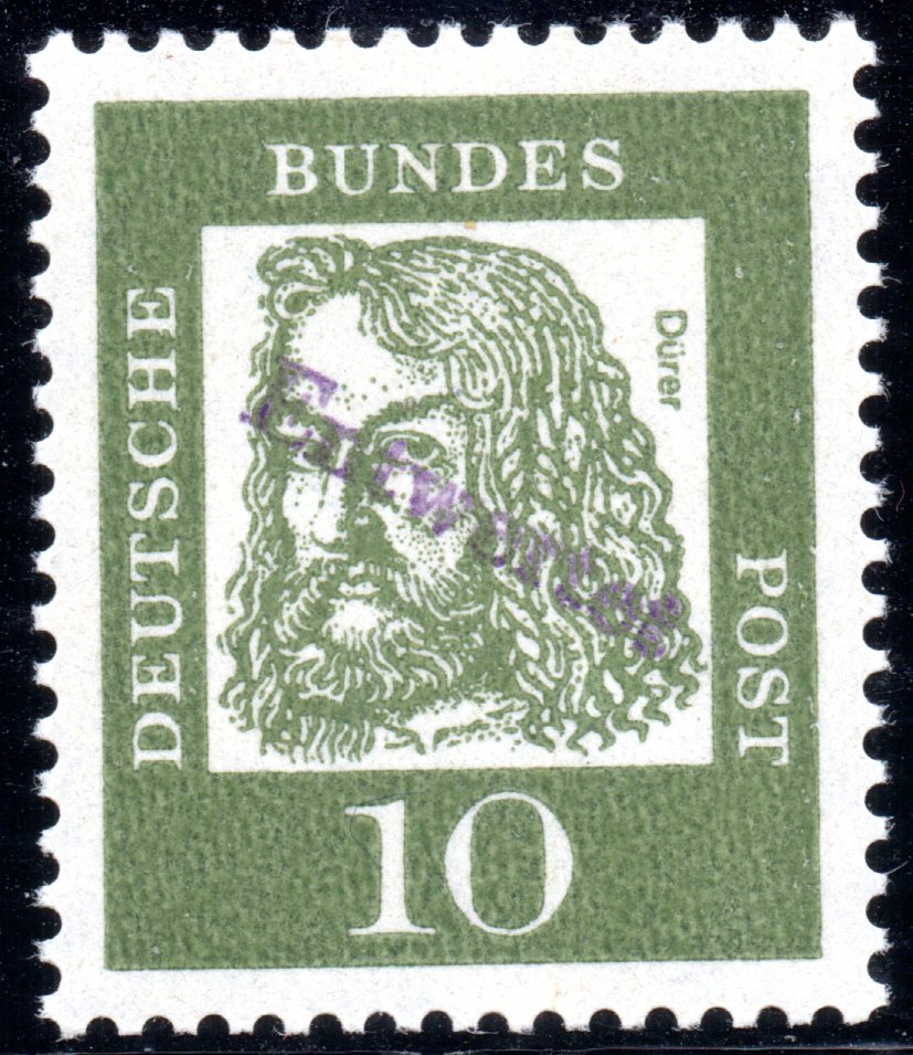 Die von der Bundesdruckerei für Testzwecke gelieferten Briefmarken wurden zur Verhinderung von Missbrauch mit einem blauviolettem Handstempel "entwertet" oder "wertlos" versehen. Eine Prüfung dieser Stempel auf ** Einzelmarken ist derzeit nicht möglich!