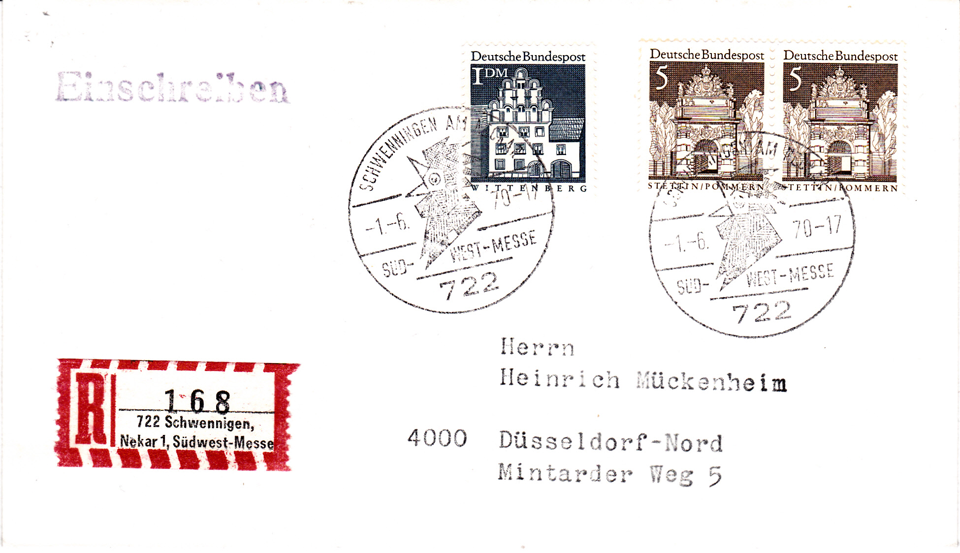 Brief per Einschreiben von Schwenningen am Neckar nach Düsseldorf mit einem Sonder-R-Zettel " 722 Schwenningen, Neckar 1, Südwest-Messe" und dem dazu gehörenden Sonderstempel vom 1.6.1979 zur Südwest-Messe in Schwenningen.