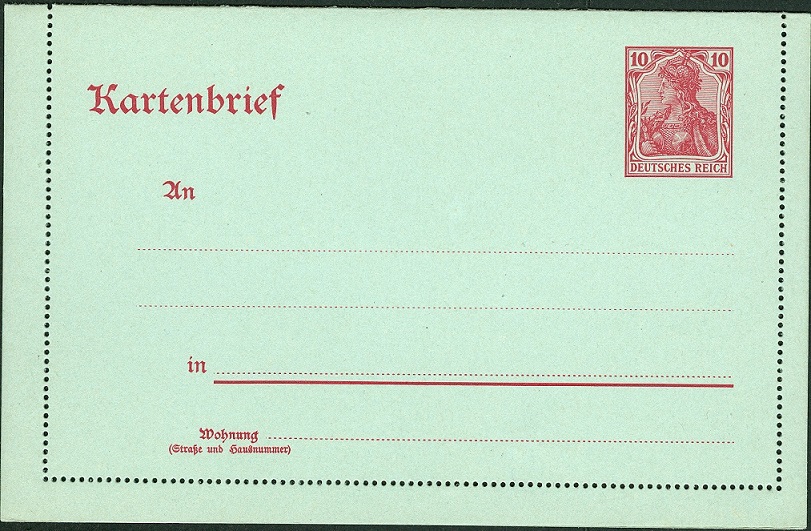 Die Deutsche Reichspost schuf den Kartenbrief als neuen Versendungsgegenstand am 01.11.1897. Von den Postanstalten im Reichspostgebiet wurden bis zum Weltkrieg Vordrucke mit eingedruckten Wertzeichen (zu 10 Pf.) zum Nennwert verkauft.
