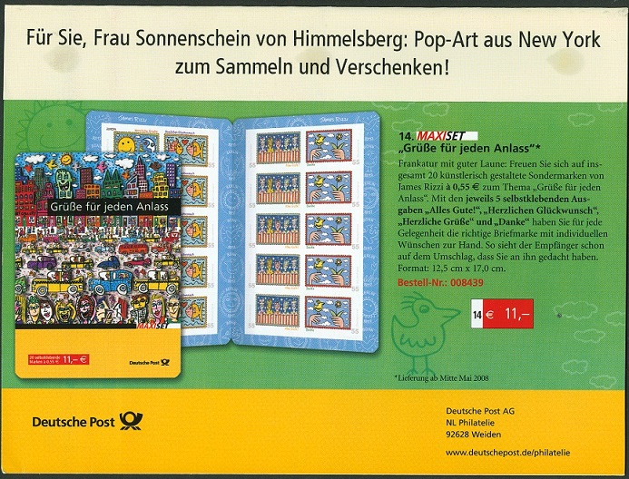 Mit dem bildgleichen Wertzeichen (55 Cent) der MiNr. 2618 und dem Vorausentwertungsdatum "-9--6.08 - 18" finden wir im Michel Ganzsachen-Katalog die Eigenausgabe F 314.