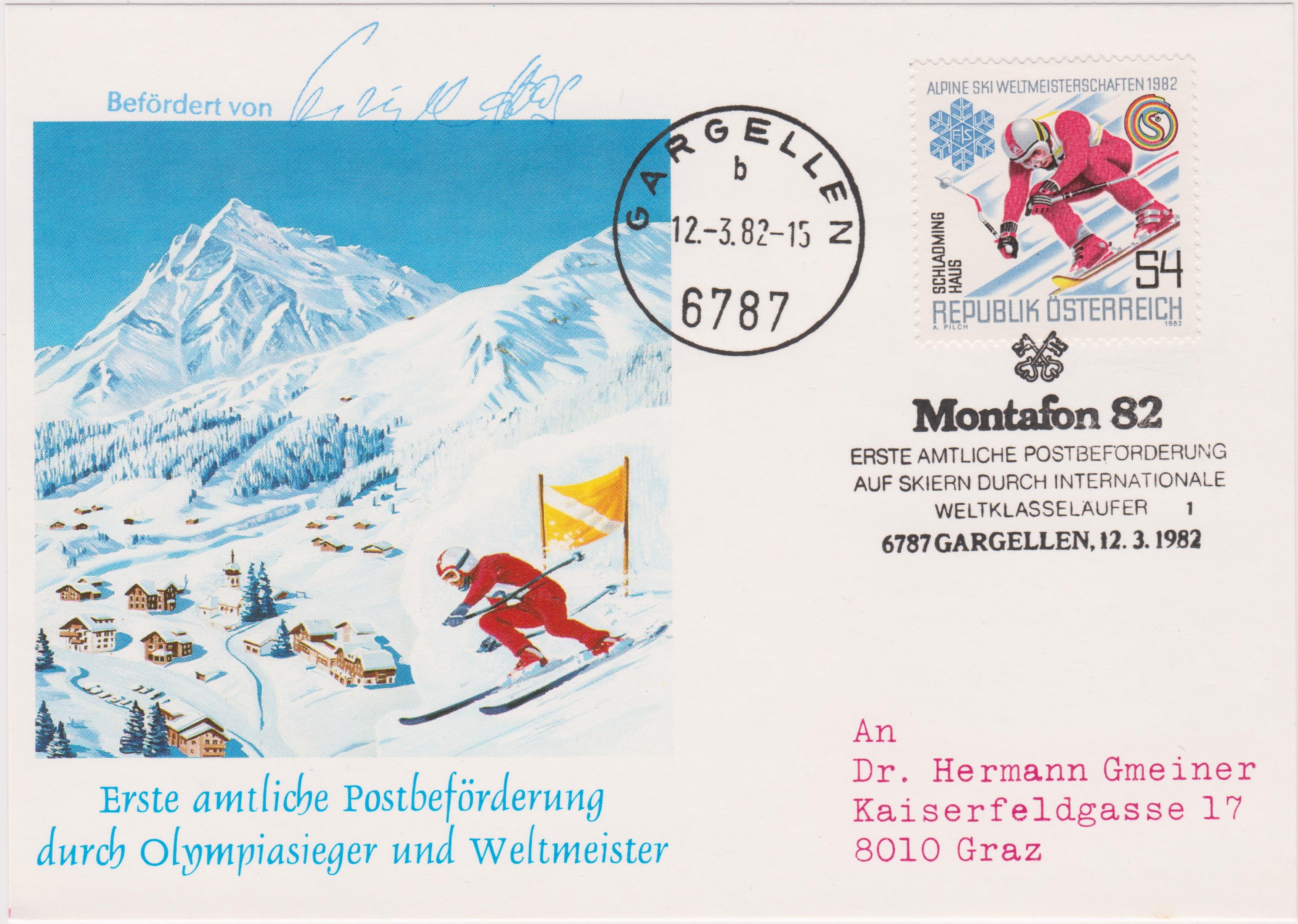 Am 12.03.1982 fand während der "Montafon 82" die "Erste AMTLICHE POSTBEFÖRDERUNG AUF SKIERN DURCH INTERNATIONALE WELTKLASSELÄUFER" statt. Oben links wurde eingedruckt "Befördert von", gefolgt vom Namen des jeweiligen Skifläufers, hier "Christl Haas".