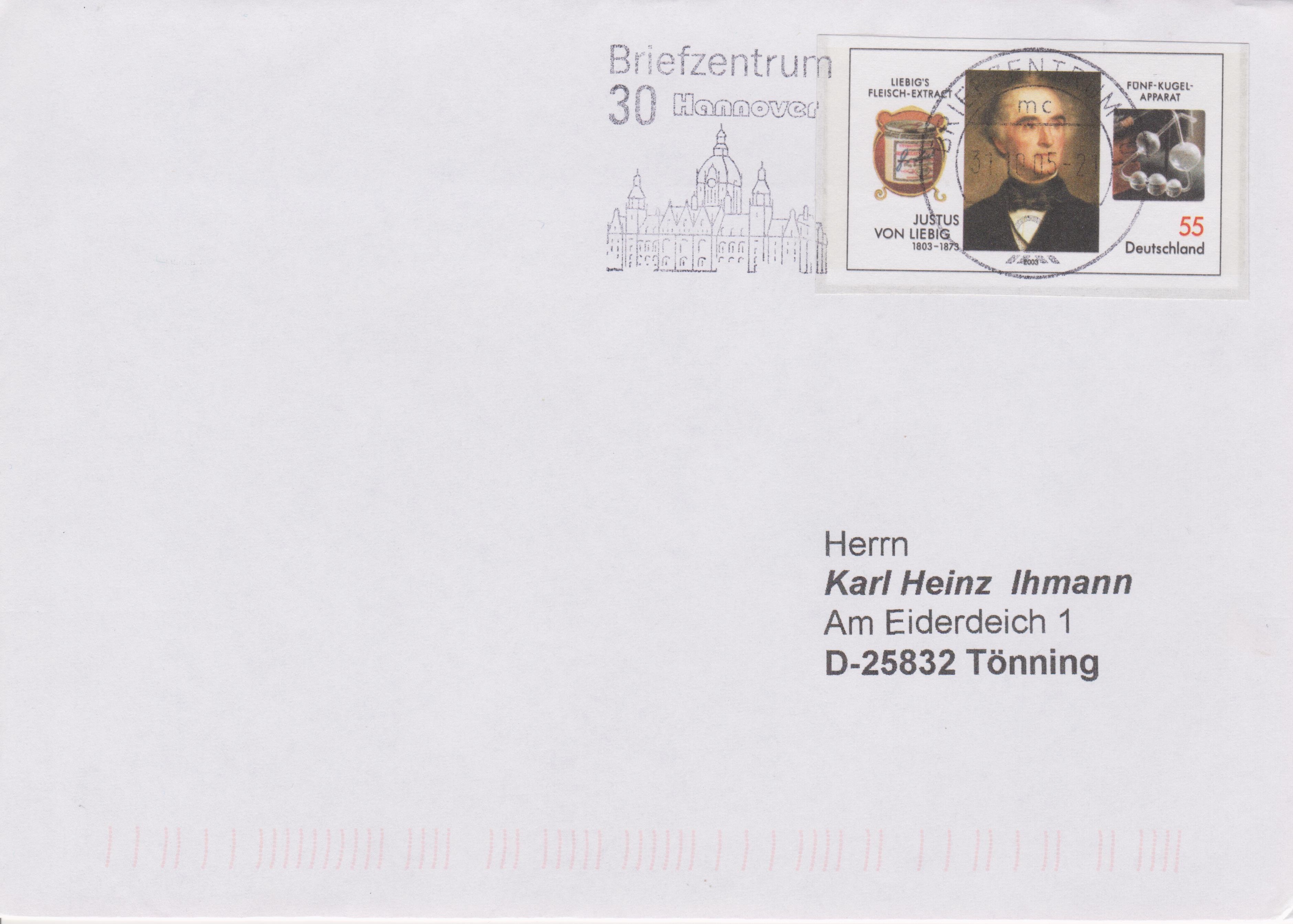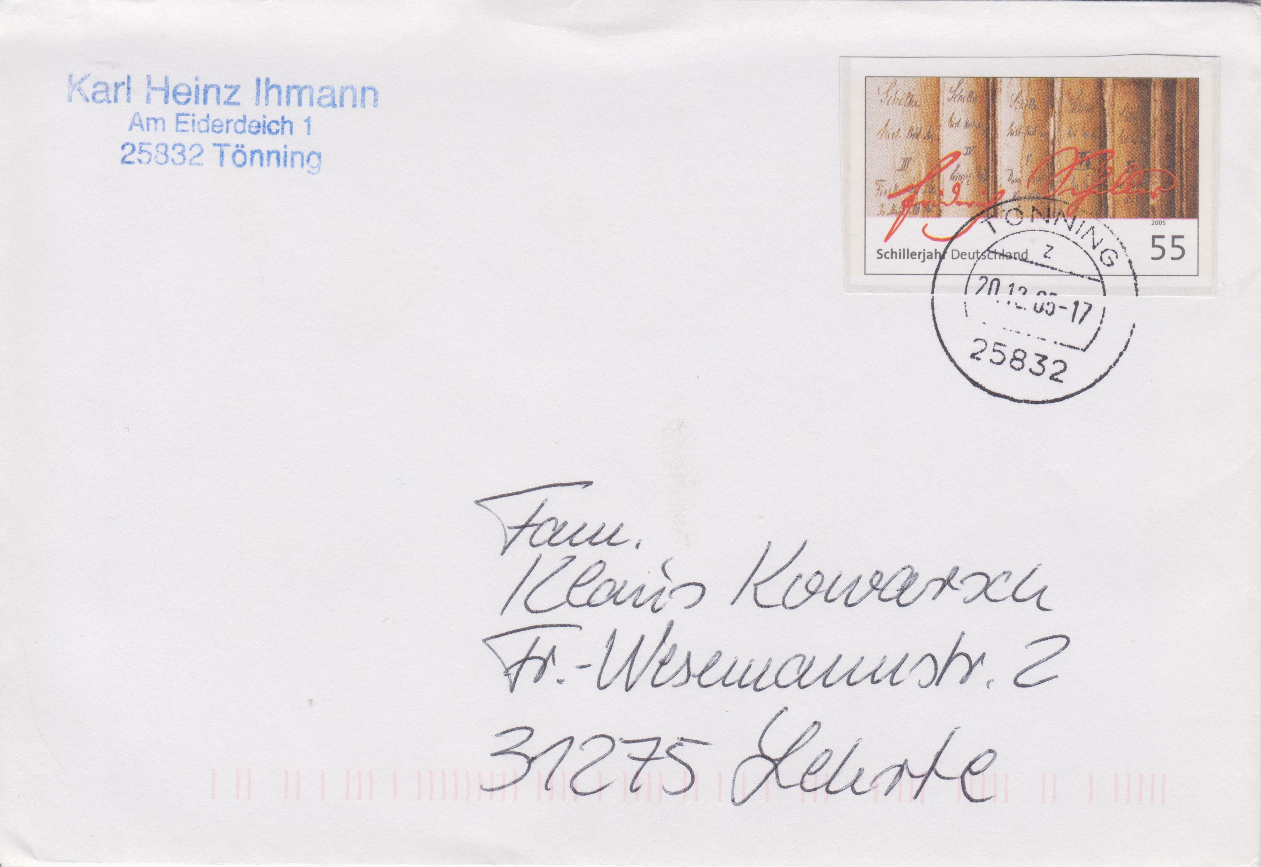 Inlandsbrief, Portostufe 55 Cents, frankiert mit einem Ausschnitt der MiNr. 2497 aus einer Ganzsache, adressiert nach "25832 Tönning", aufgegeben am 31.10.2005 "Briefzentrum 30 Hannover":