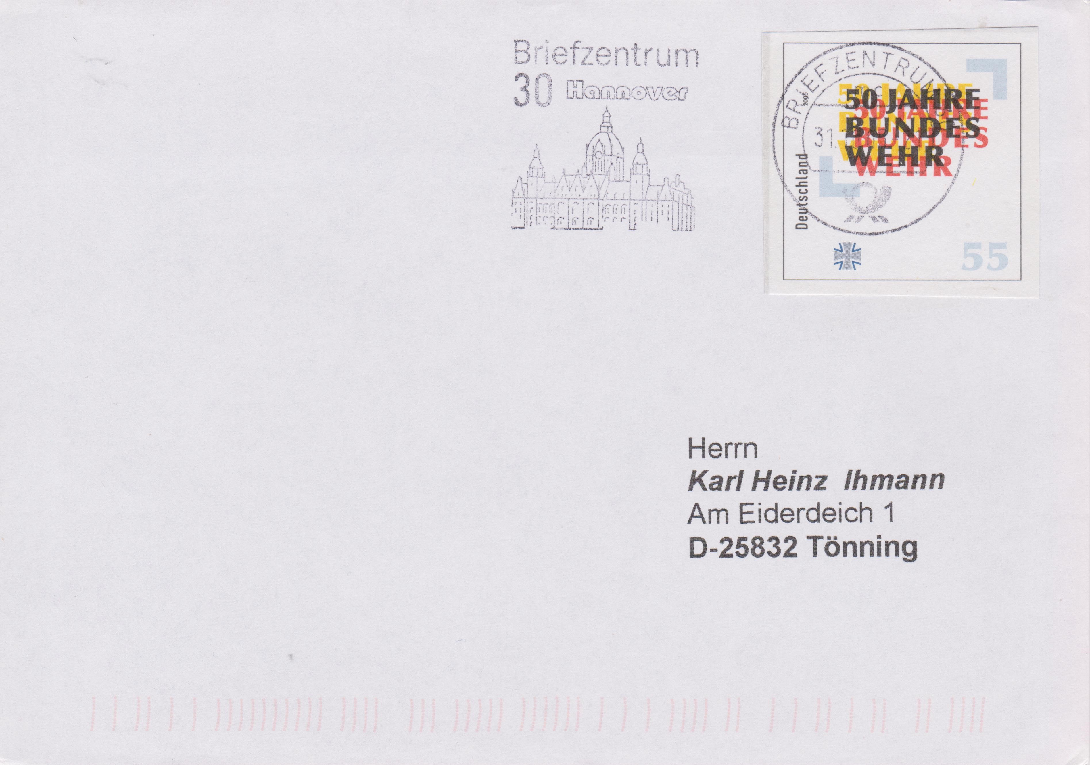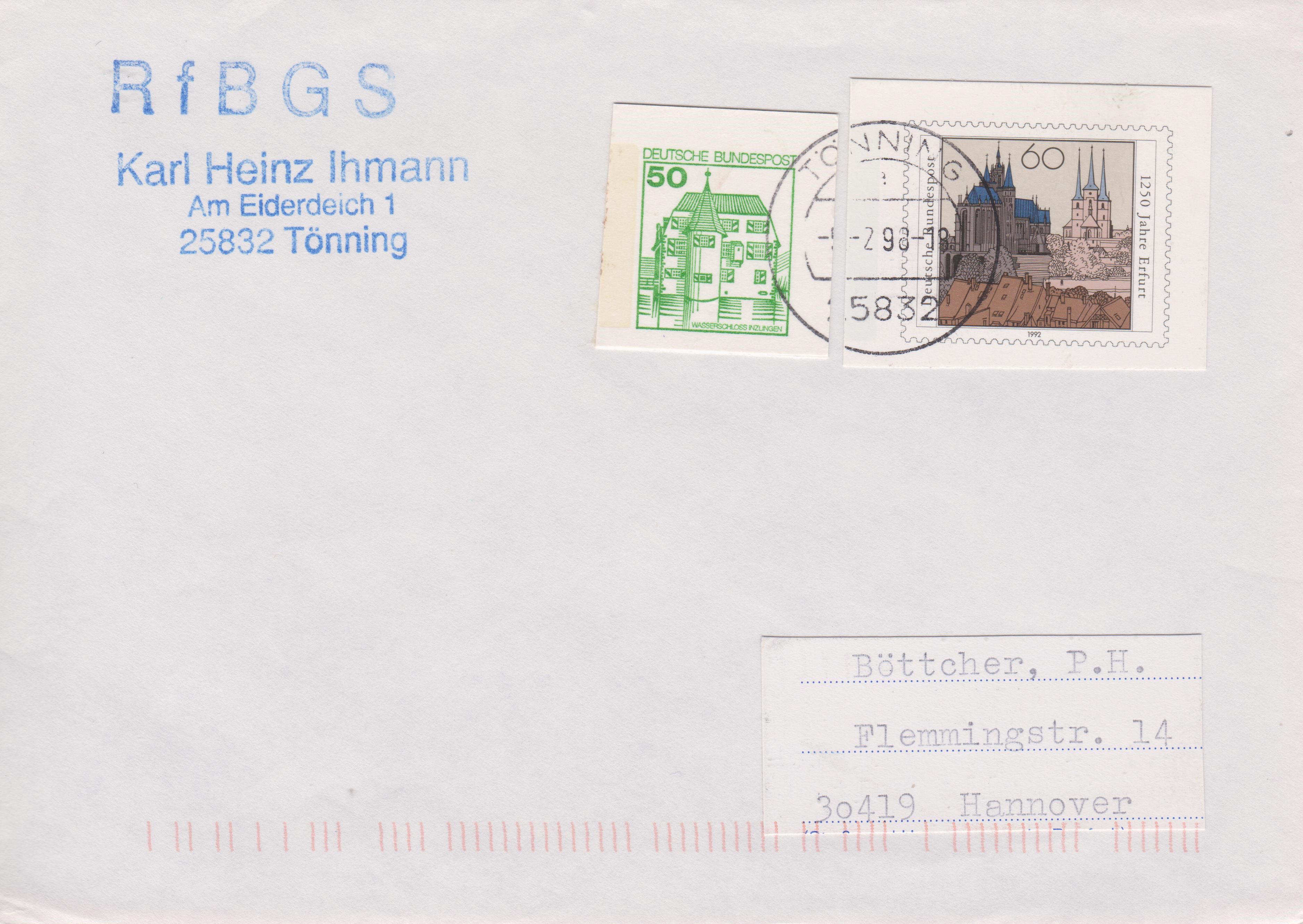 Inlandsbrief, Portostufe 110 Pf, frankiert mit einem Ausschnitt der MiNr. 1611 aus einer Ganzsache PSo 28 sowie einem Ausschnitt der MiNr. 1038 aus einer Ganzsache, adressiert nach "30419 Hannover", aufgegeben am 05.02.1998 in 25832 TÖNNING, echt gelaufen mit entsprechender Codierung: