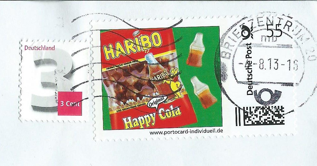 Zum heutigen Abschluss noch etwas zum Naschen: Motiv HARIBO Happy-Cola als 55 ct Wertstufe. Da 2013 die Portostufe 58 ct betrug, musste die Ergänzungsmarke zu 3 ct mit verklebt werden, um eine Portorichtigkeit zu erlangen. Abgestempelt wurde am 4.8.13 im Briefzentrum 20.