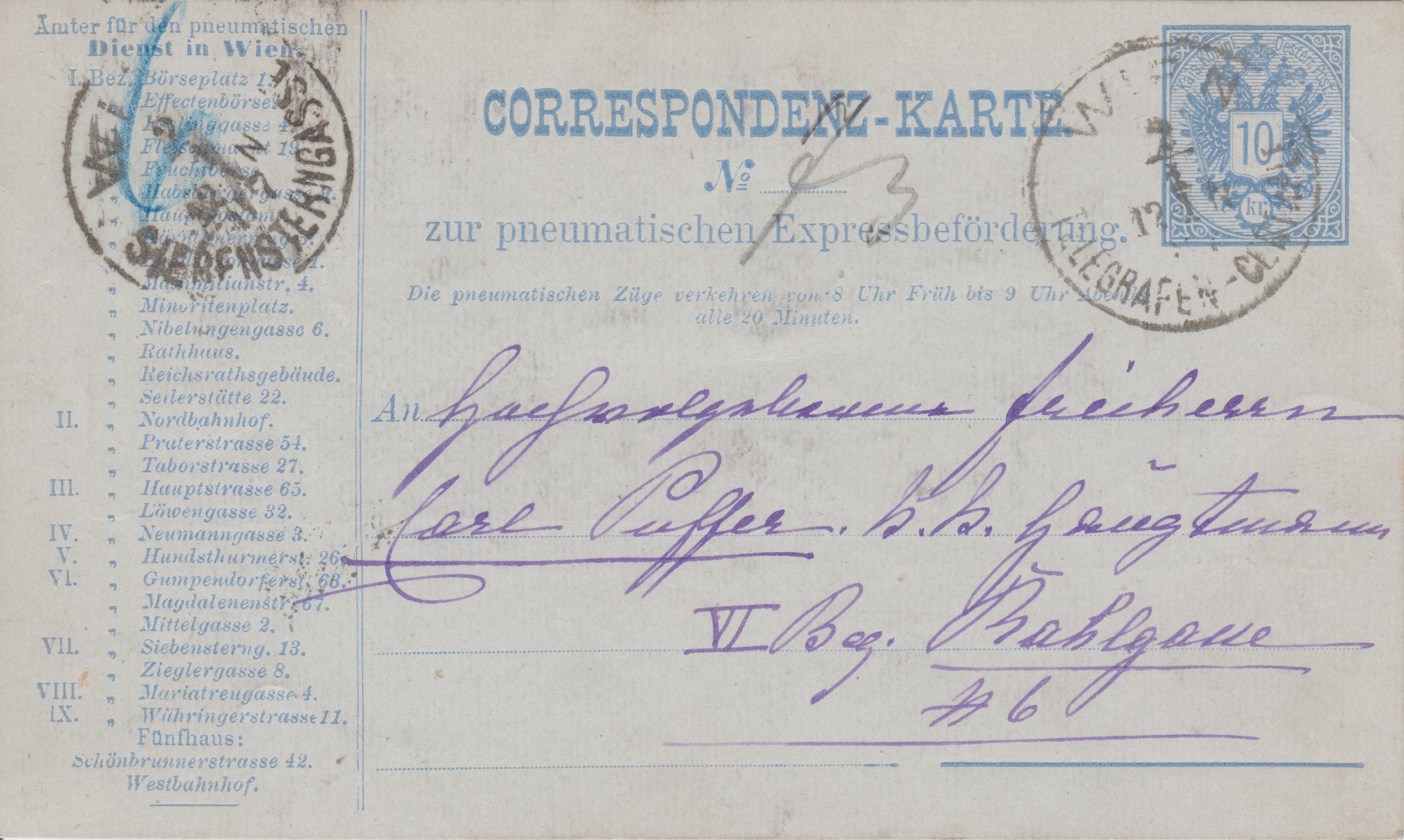 "CORRESPONDENZ-KARTE zur pneumatischen Expressbeförderung" mit einer eingedruckten Liste der "Ämter für den pneumatischen Dienst in Wien" gebraucht am 30.09.1885: