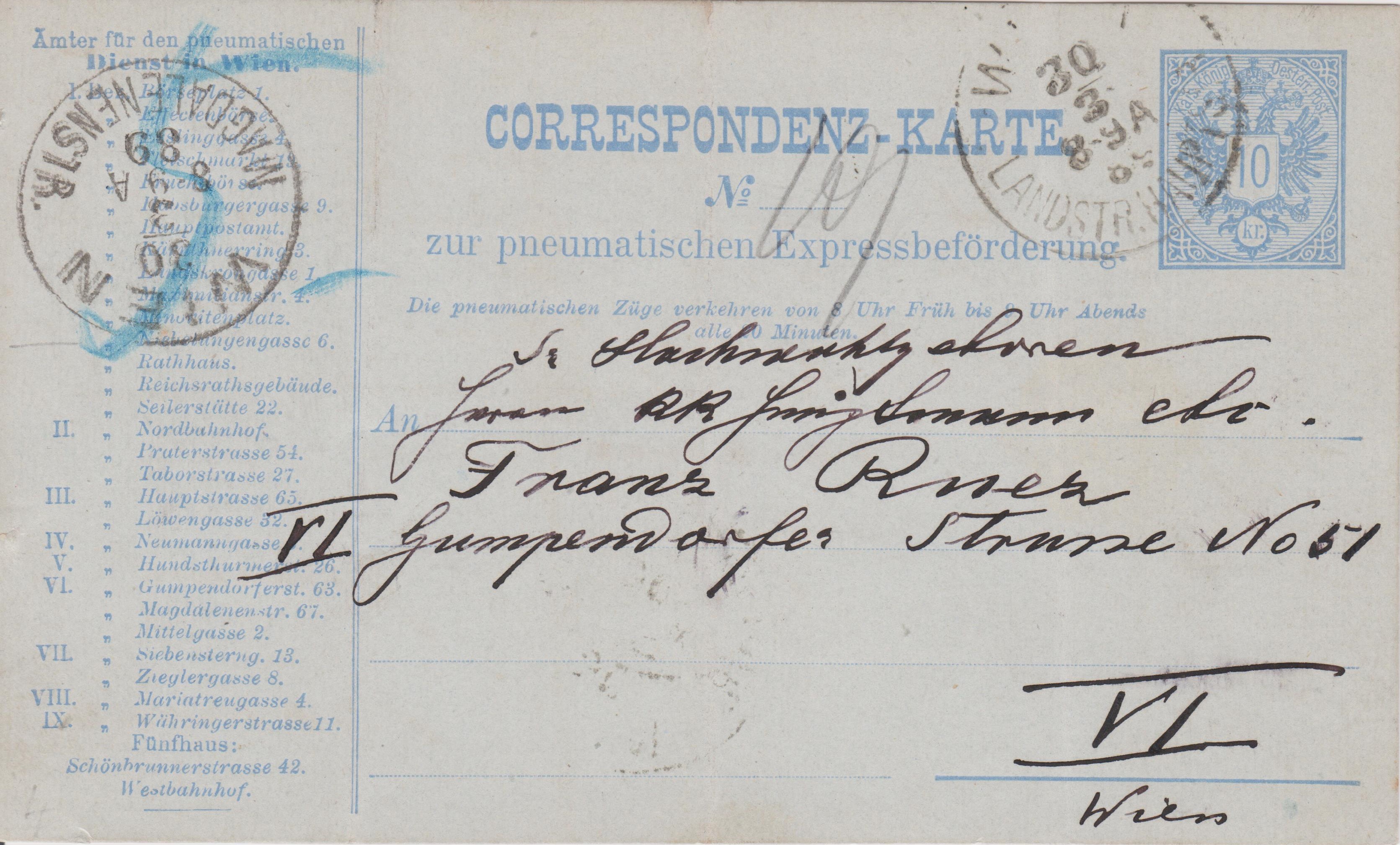 "CORRESPONDENZ-KARTE zur pneumatischen Expressbeförderung" mit einer eingedruckten Liste der "Ämter für den pneumatischen Dienst in Wien" gebraucht am 30.03.1889:
