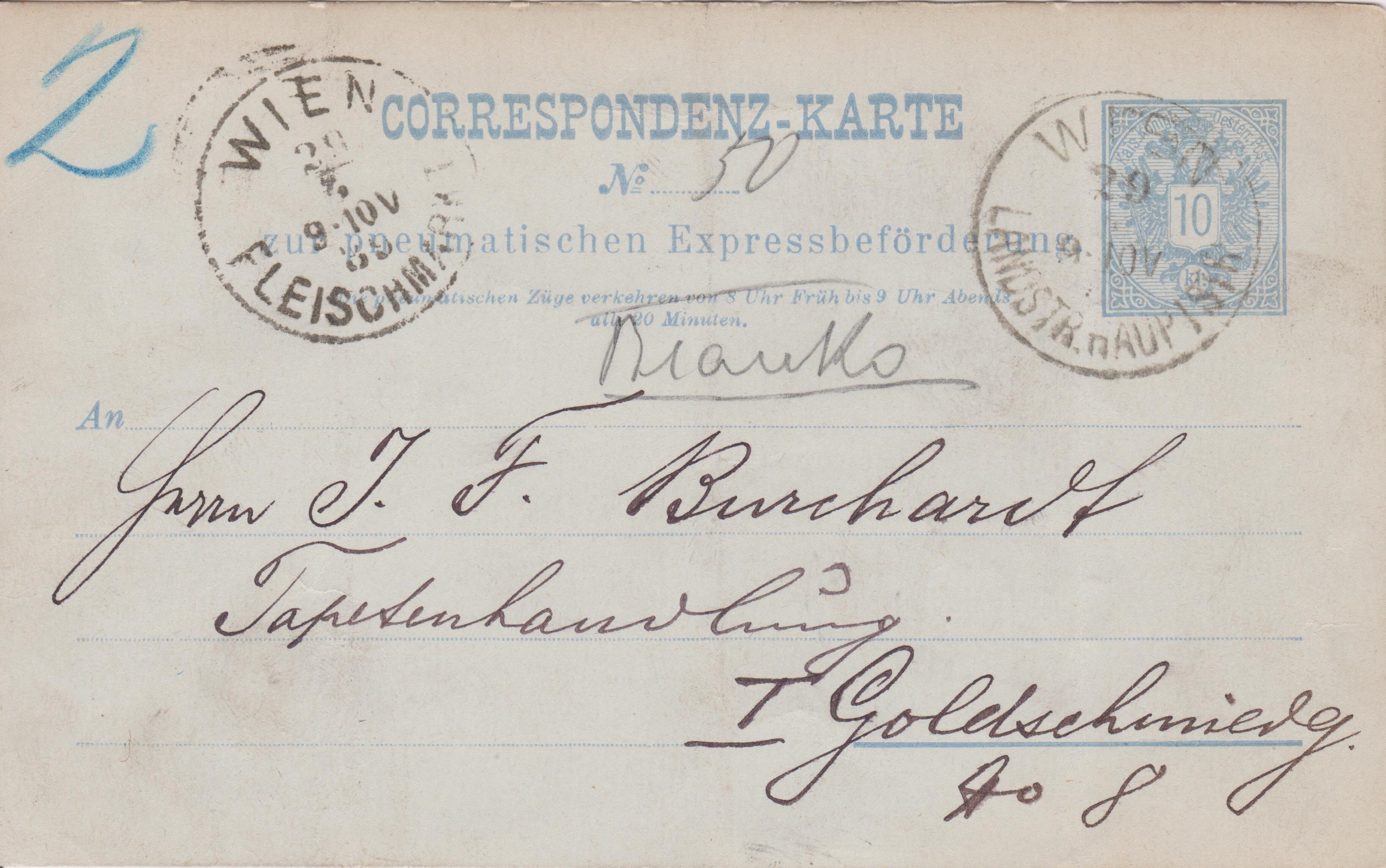 "CORRESPONDENZ-KARTE zur pneumatischen Expressbeförderung" gebraucht am 23.11.1888: