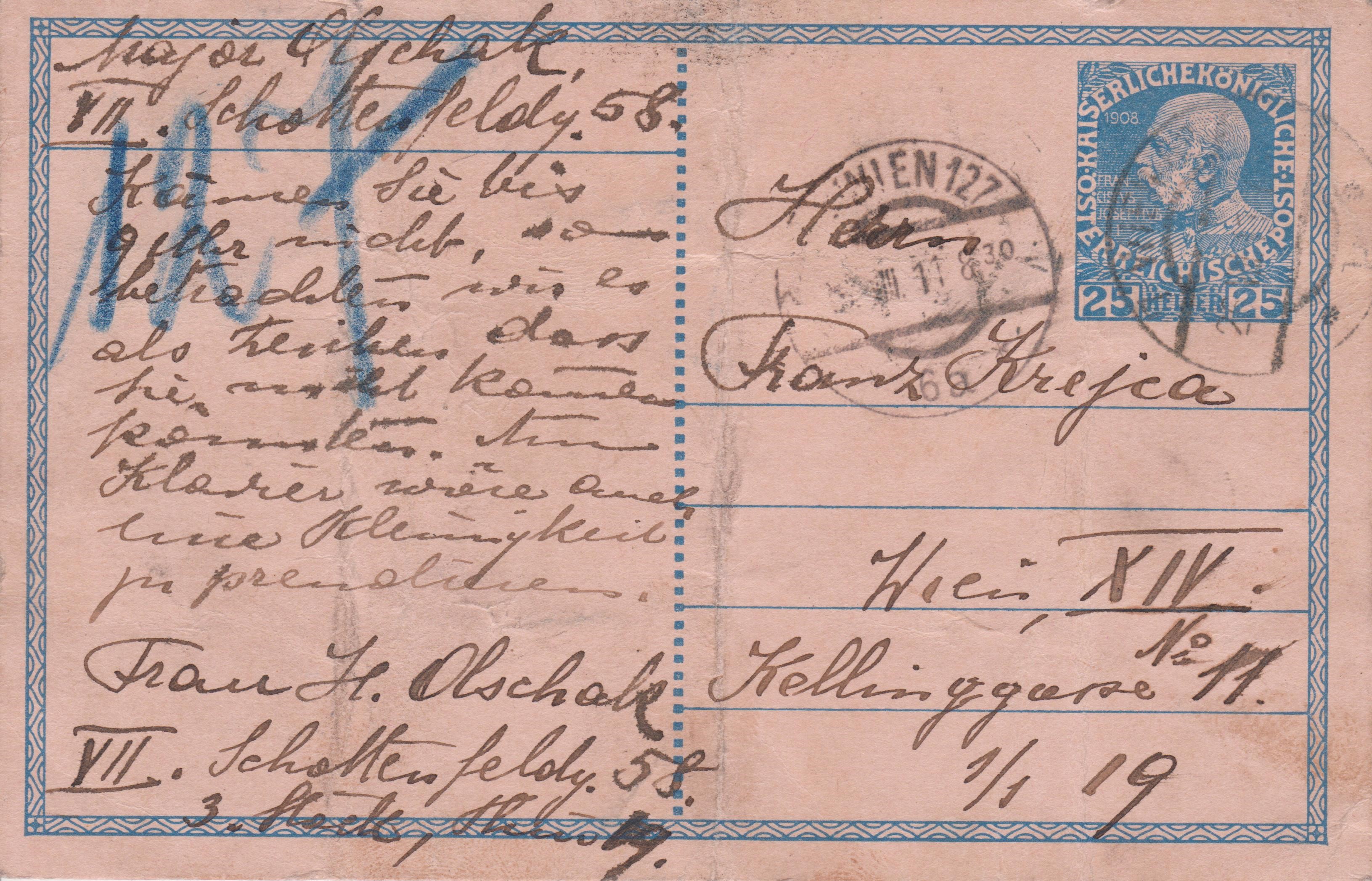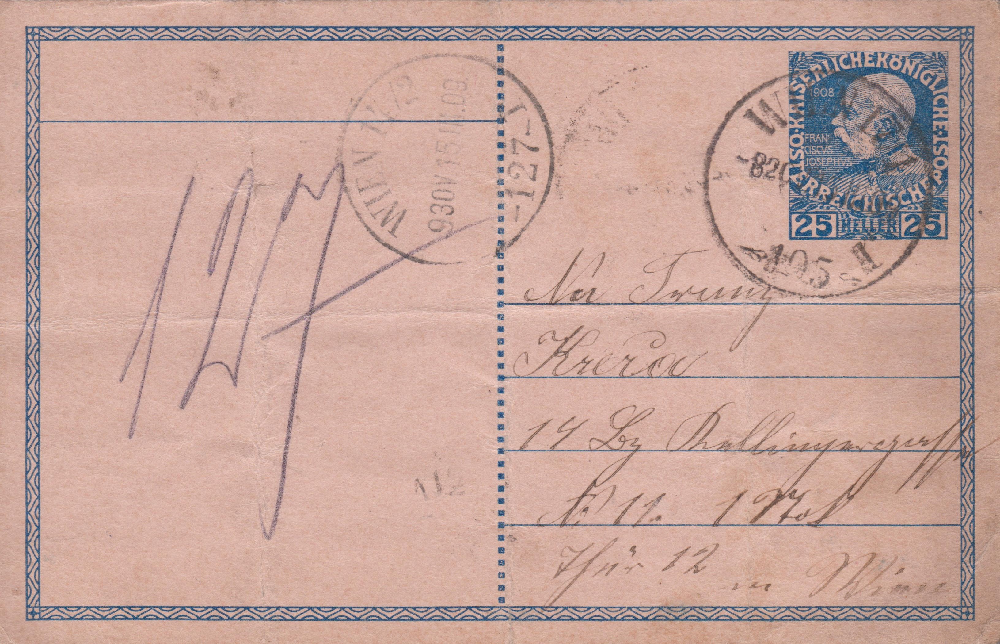 Diese Rohrpostkarte wurde am 26.08.1911 mit der Wiener Rohrpost nach WIEN 127 befördert:
