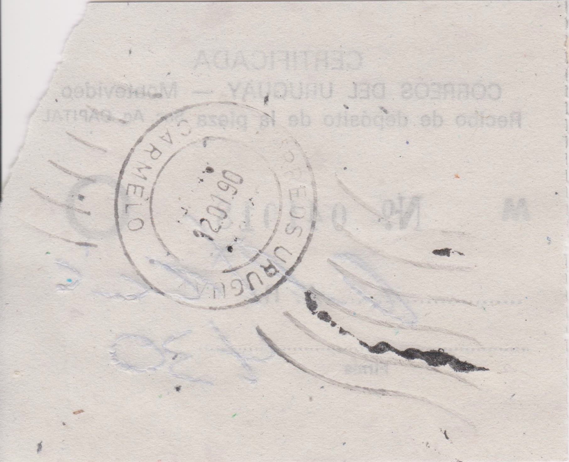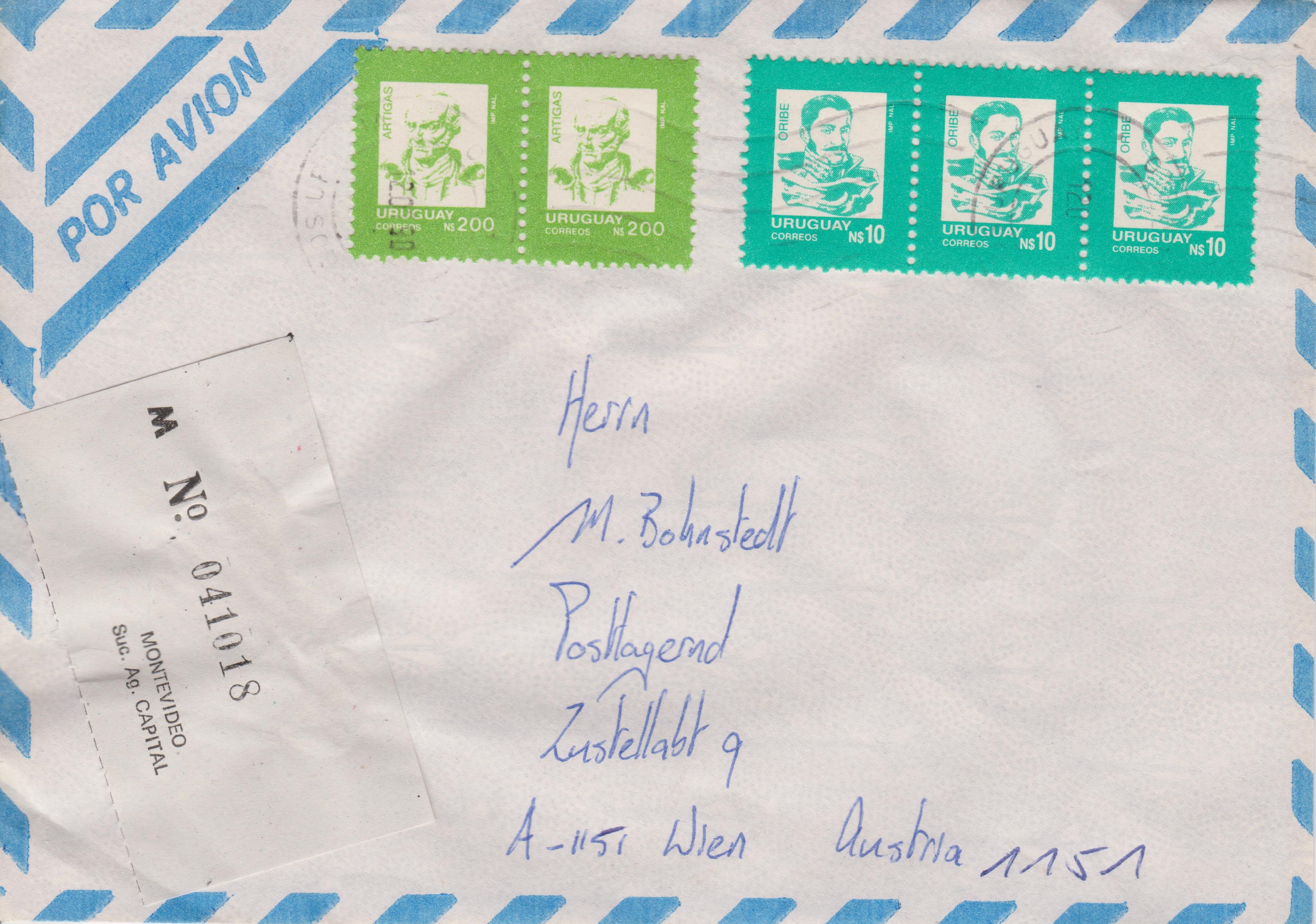 Einlieferungsschein zu einem Luftpostbrief per Einschreiben nach 1151 Wien Austria, aufgegeben am 12.01.1990 in MONTEVIDEO, Uruguay: