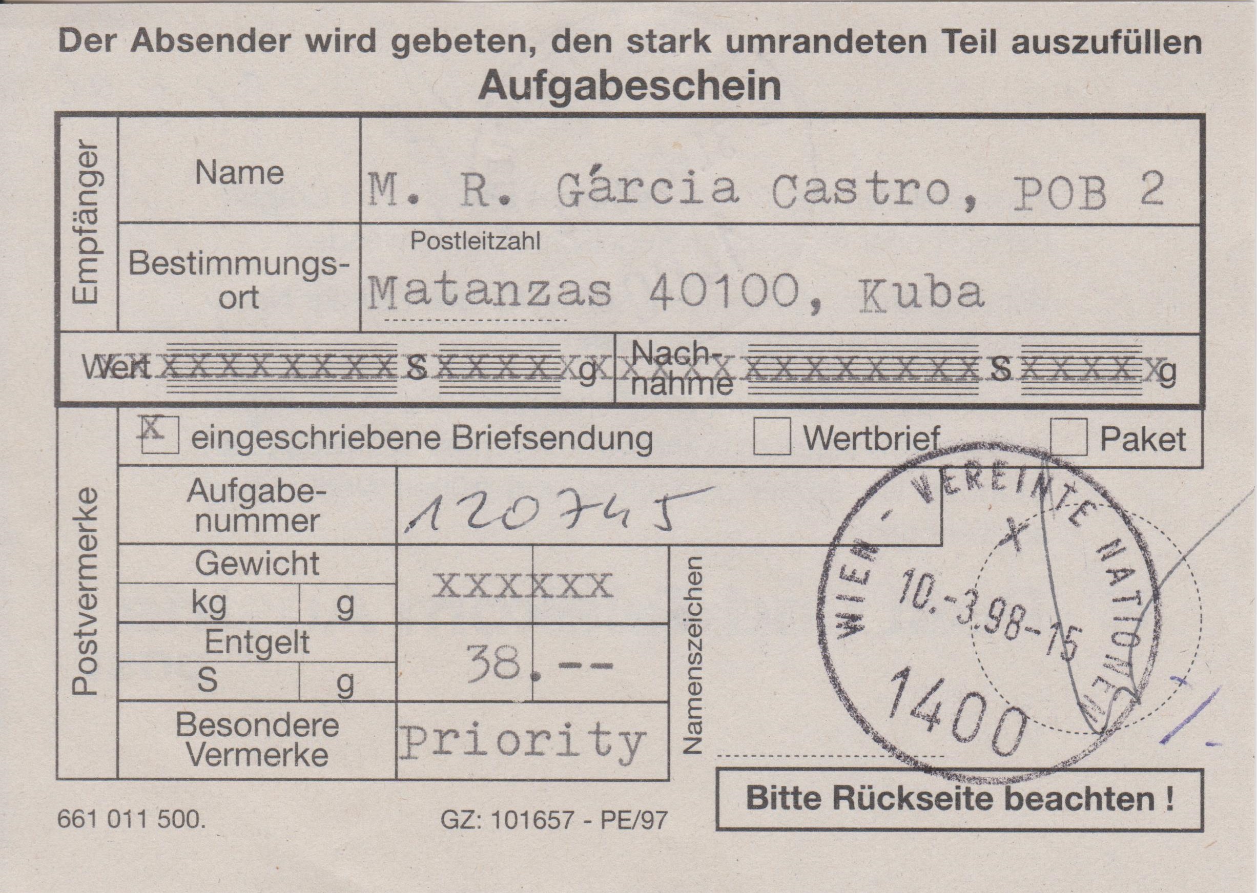 Einlieferungsschein zu einem Brief per Einschreiben nach Cuba, aufgegeben am 10.03.1998 in 1400 WIEN - VEREINTE NATIONEN: