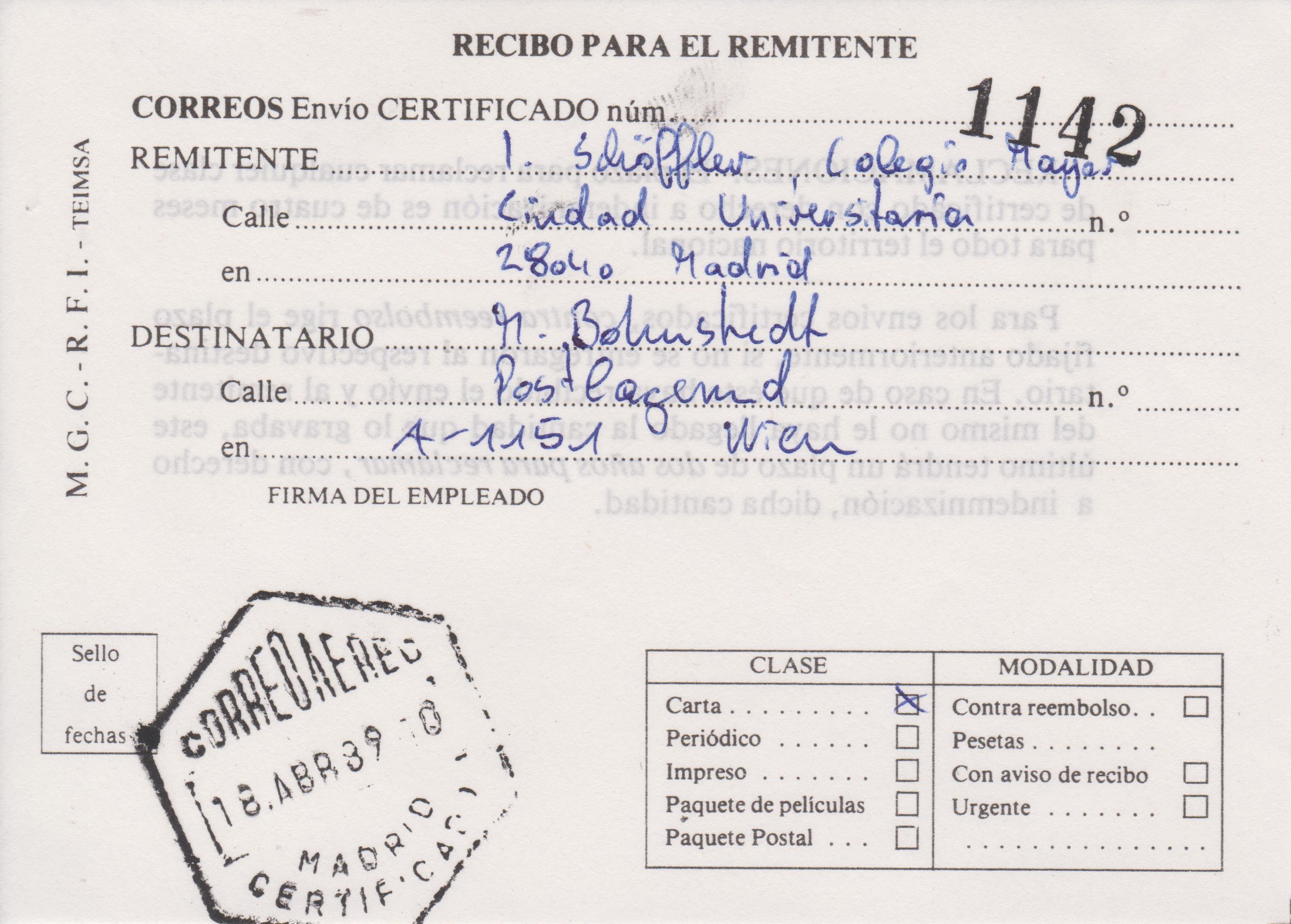 Einlieferungsschein zu einem Luftpostbrief per Einschreiben nach 1151 WIEN, aufgegeben am 18.04.1989 in MADRID in Spanien: