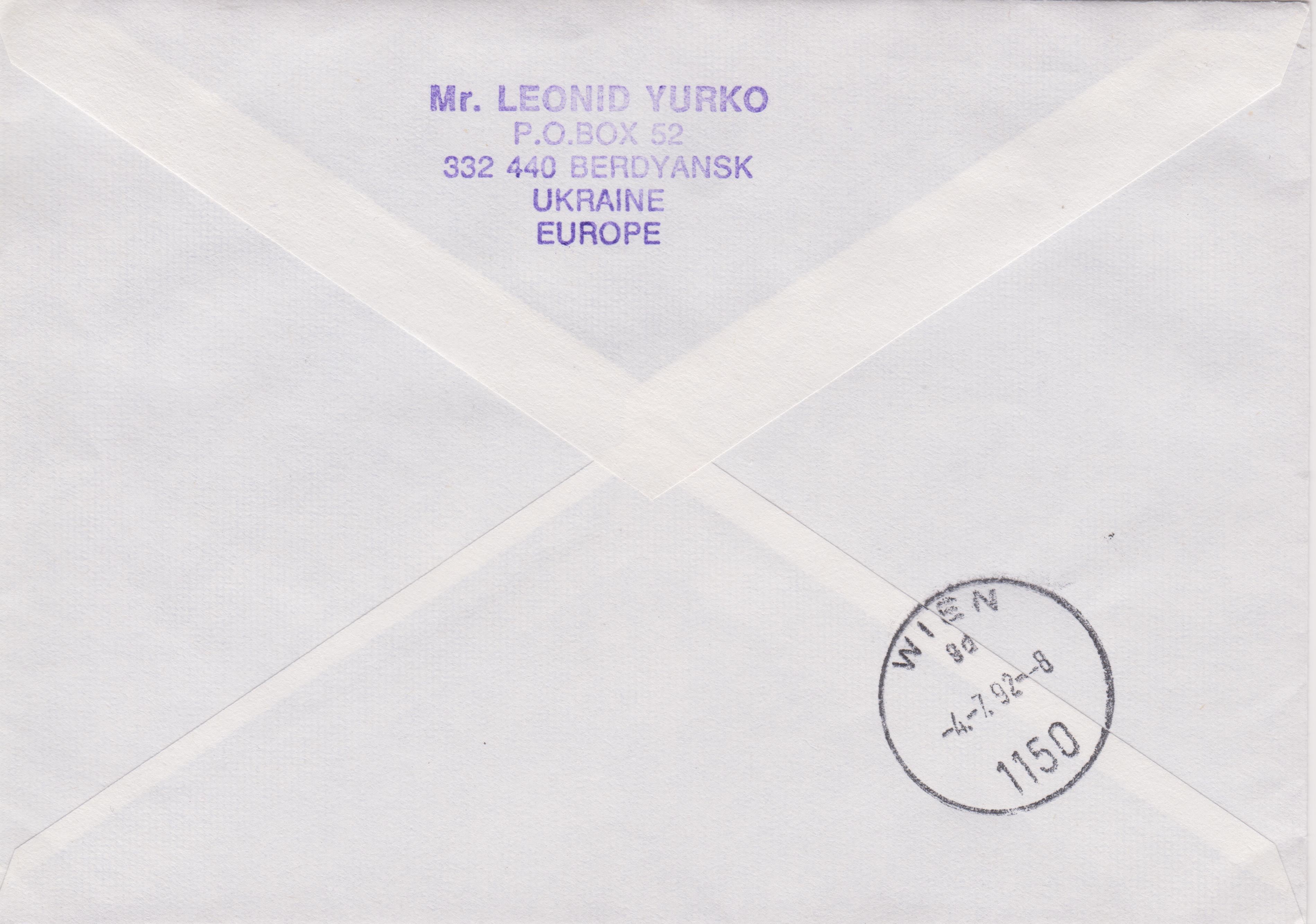 Einlieferungsschein zu einem Brief per Einschreiben, Einlieferungsnummer "996", aufgegeben am 29.06.1992 in BERDIANSK: