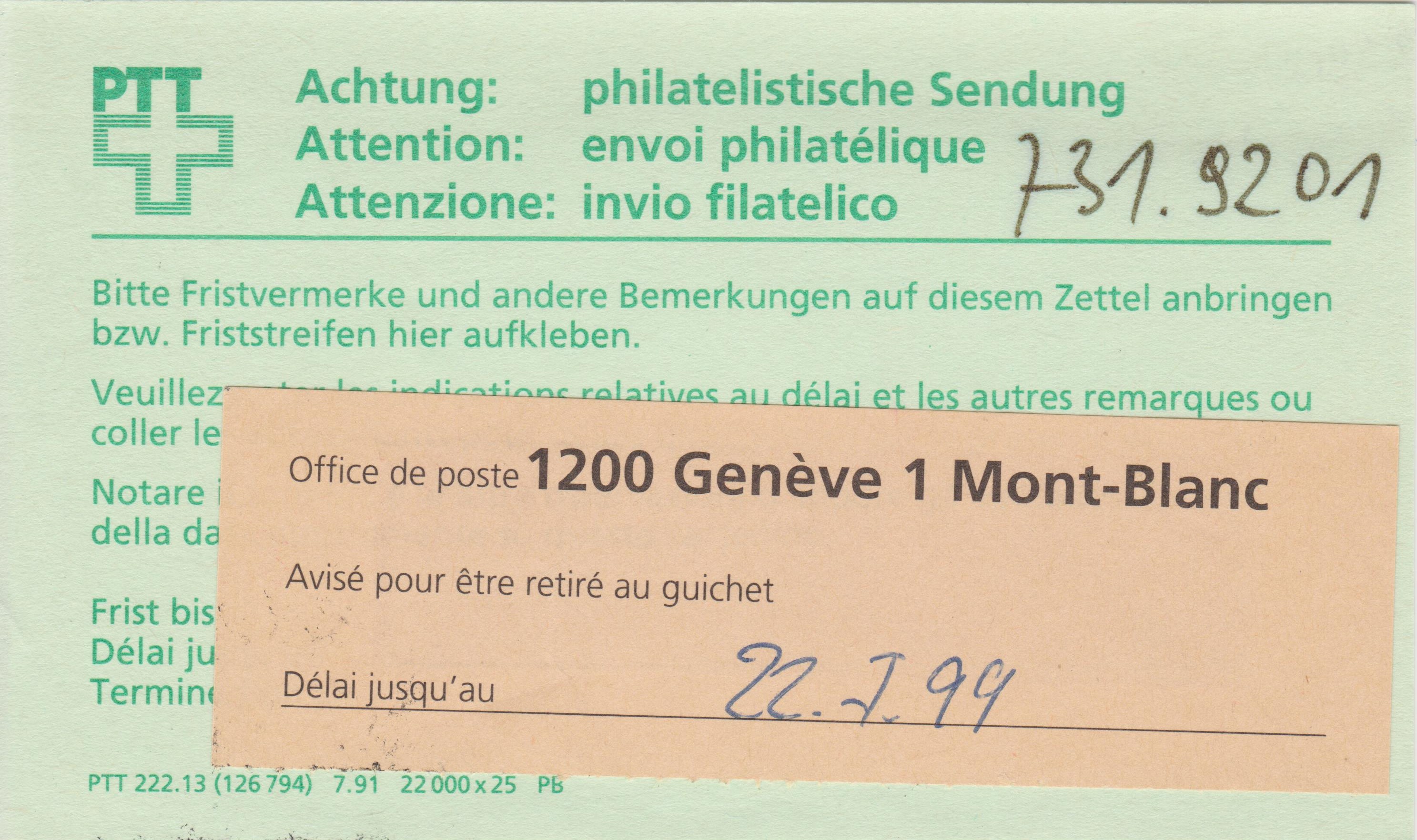 Der Brief kam am 15.07.1999 an seinem Bestimmungspostamt 1200 Genève 1 Mont-Blanc an: