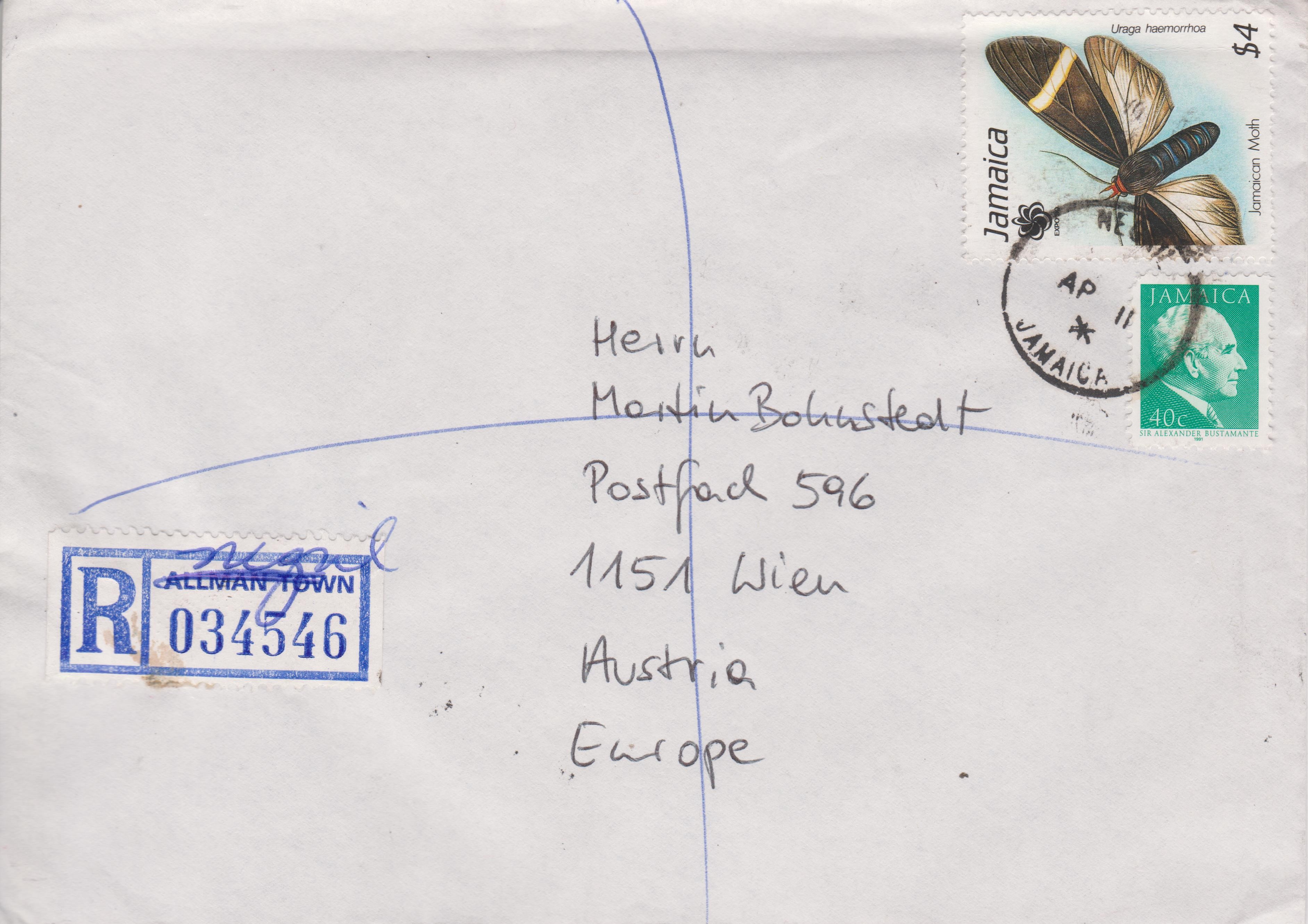 Einlieferungsschein aus JAMAICA zu einem Einschreibebrief nach Wien: