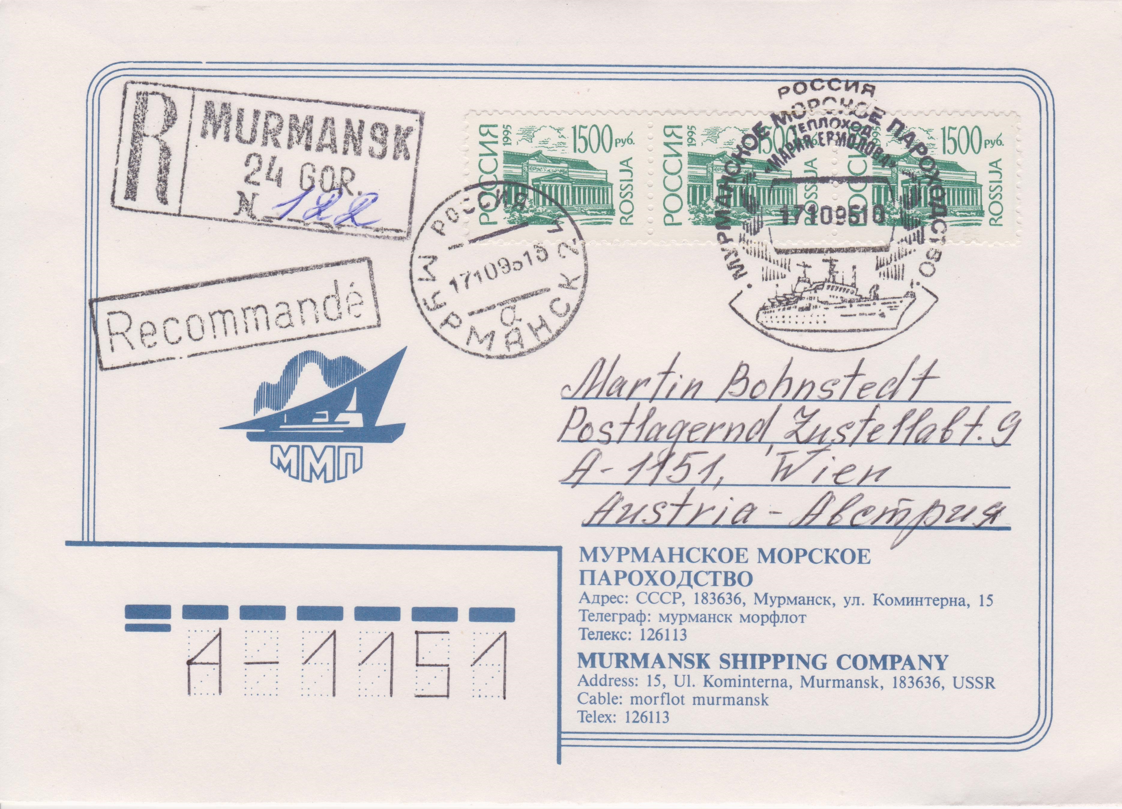 Einlieferungsschein zu einem Einschreiben nach Wien vom 17.10.1995 aus MURMANSK 24: