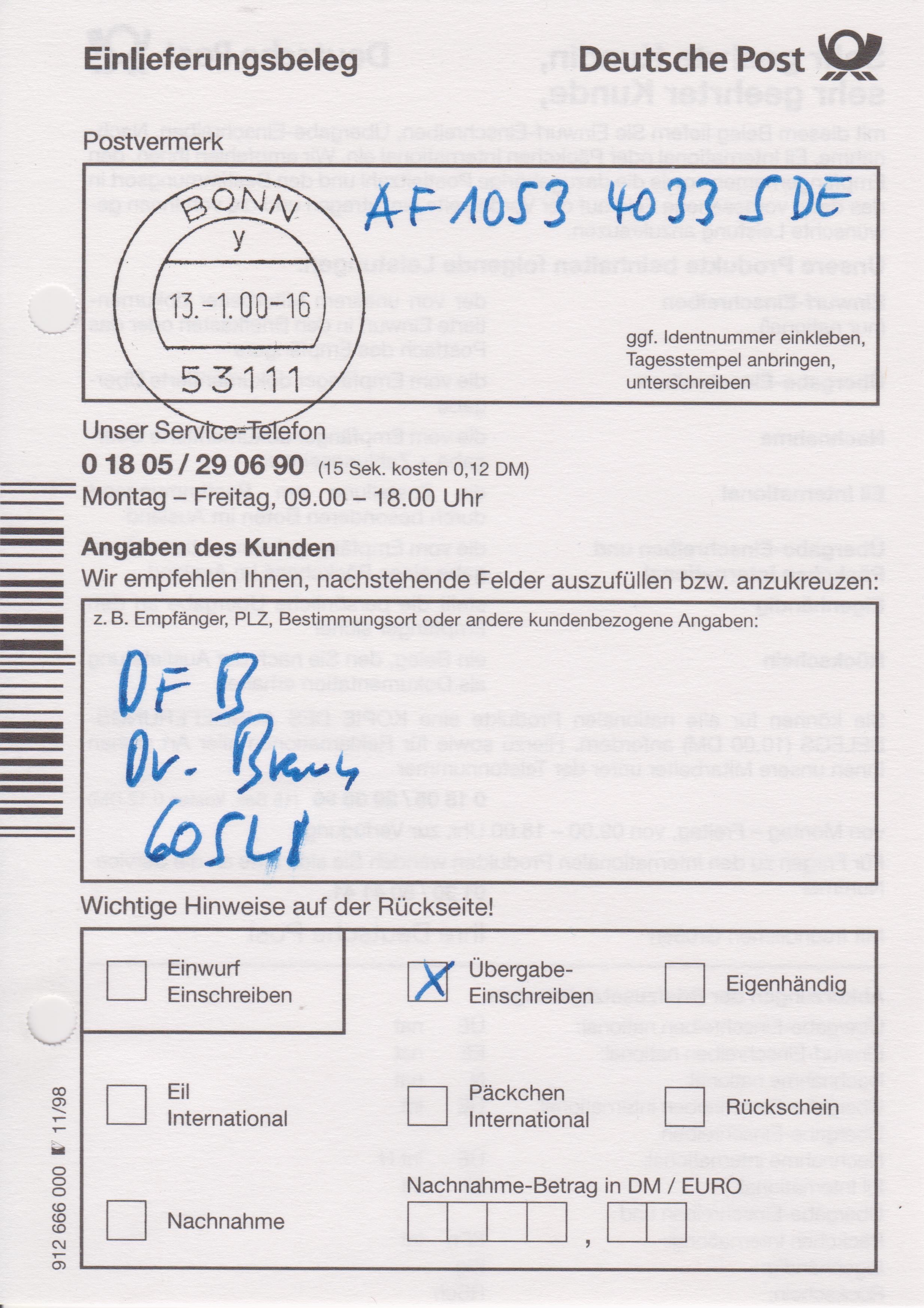 Einlieferungsschein zu einem Brief per Einschreiben nach 65510 Hünstetten-9, aufgegeben am -3.-3.03 in 53111 BONN: