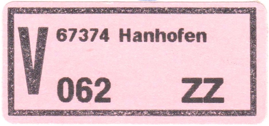V-Zettel 67374 Hanhofen mit der Nummer "062" und "zz":