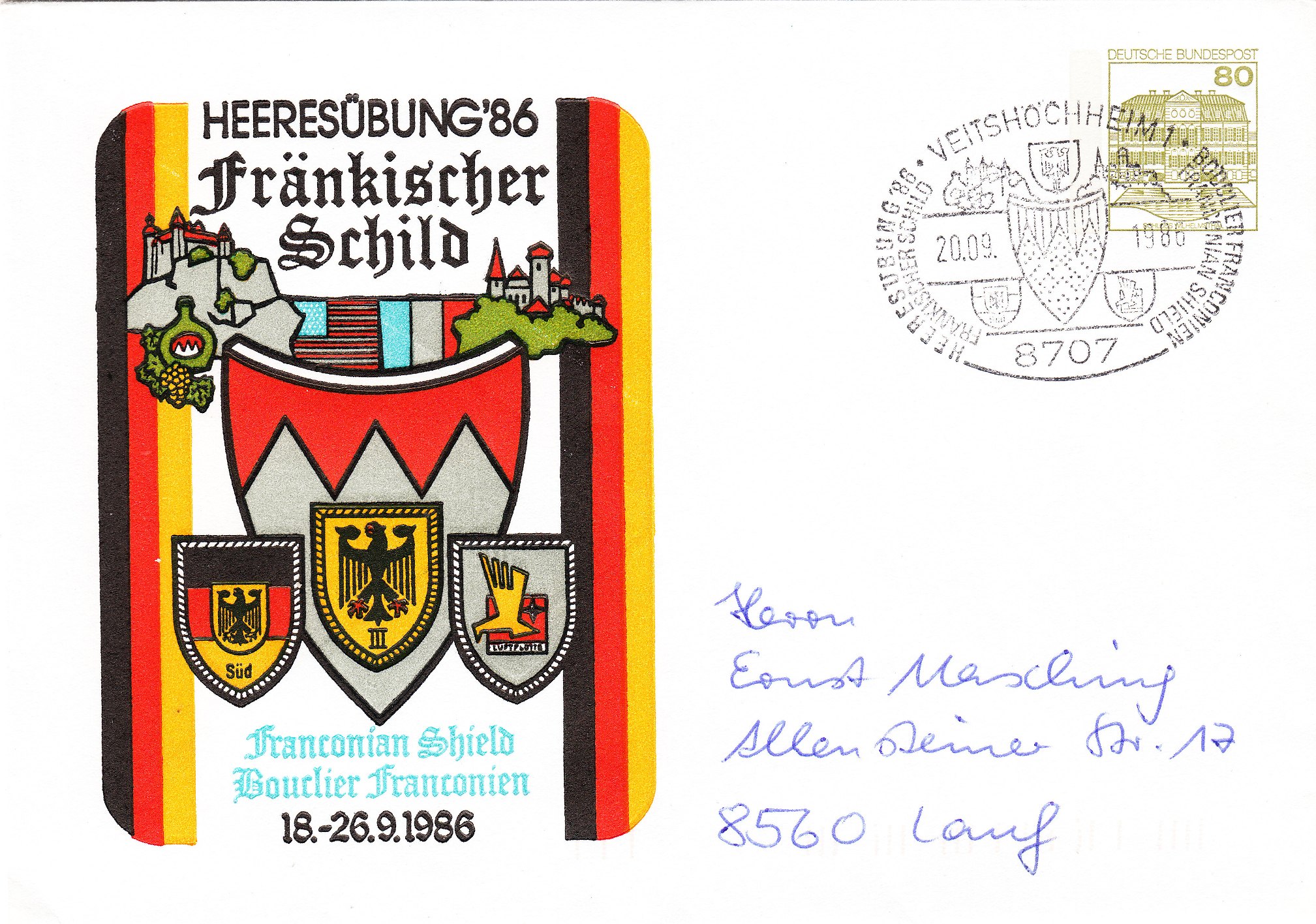 Diese Ganzsache wurde während der Heeresübung "Fränkischer Schild" 1986 am 20.09.1986 in VEITSHÖCHHEIM aufgegeben und wurde dort mit einem zu dieser Heeresübung aufgelegten Sonderstempel entwertet: