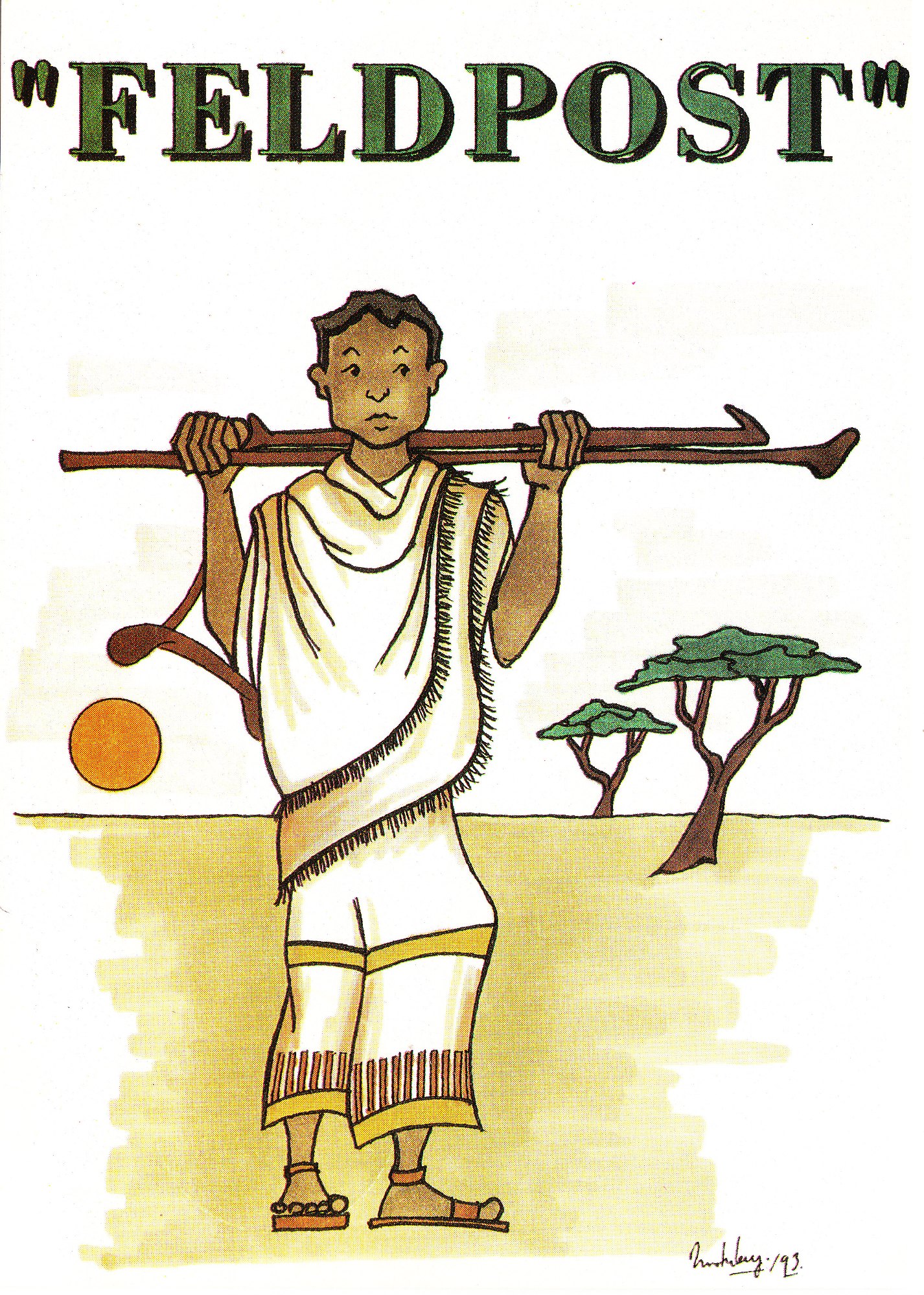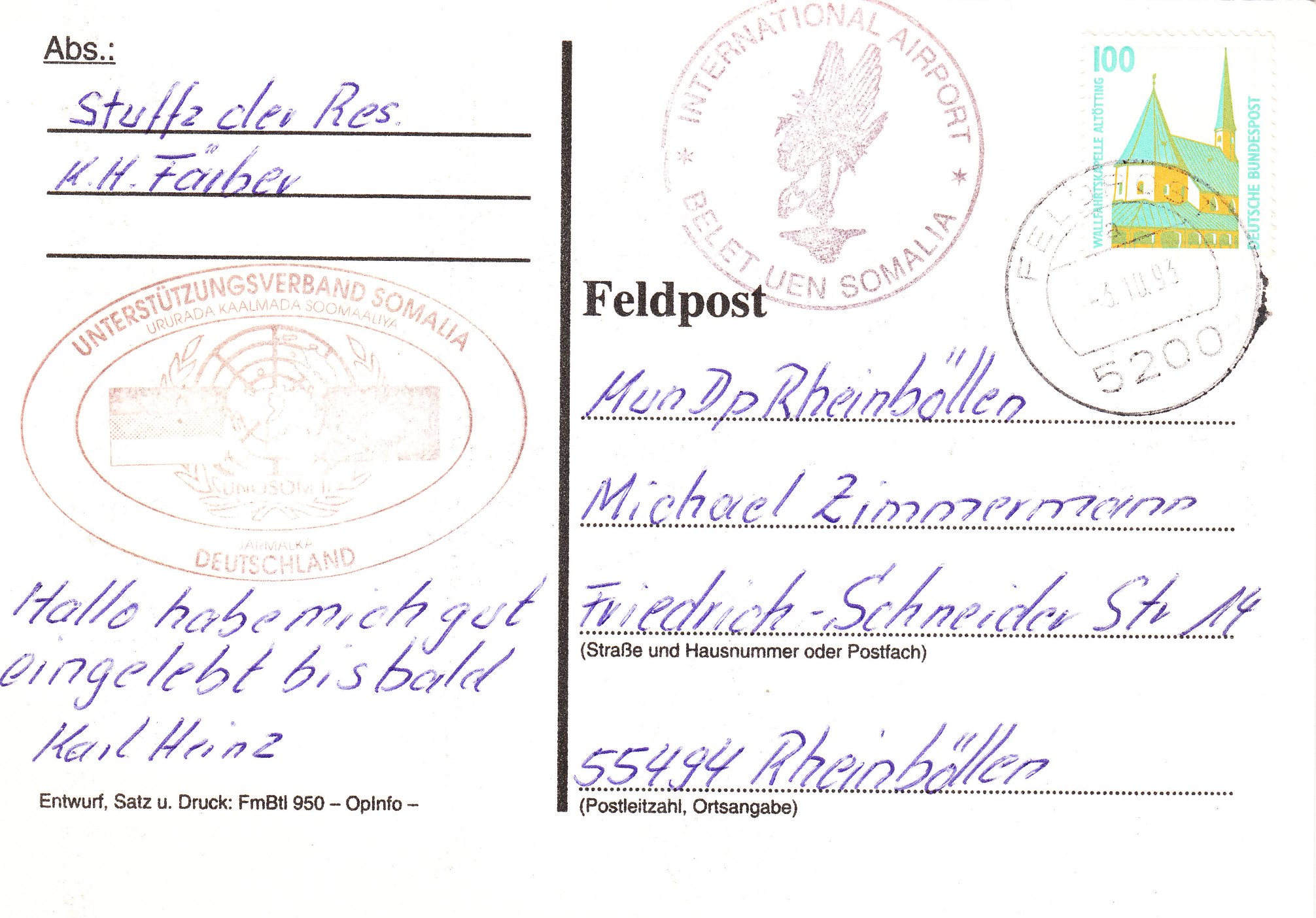Diese Postkarte wurde am 03.10.1993 in Somalia von einem Soldaten des deutschen Heereskontingentes aufgegeben und mit einem Tagesstempel "FELDPOST 5200 a" im deutschen Feldpostamt in Belet Uen entwertet:
