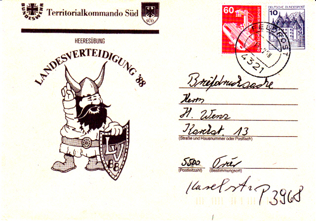 Diese Karte wurde während der Heeresübung "Landesverteidigung" am 11.9.1988 beim Feldpostamt 4321, dem Feldpostamt Trier der Nachschubkompanie 540, aufgegeben. Da der Stempel zur Entwertung nicht zu lesen war, wurde ein zweiter Stempel neben der Marke abgeschlagen.