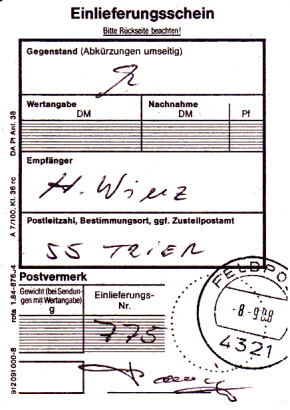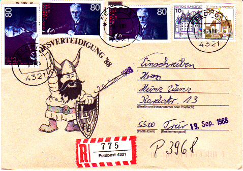 Ein Recycling Umschlag der Deutschen Bundespost wurde auch bei diesem Einschreibebrief (Porto 80 Pfennig + 200 Pfennig Einschreibegebühr) vom 8.9.1988 verwendet, der während der Heeresübung "Landesverteidigung" am 11.9.1988 beim Feldpostamt 4321, dem Feldpostamt Trier der Nachschubkompanie 540, aufgegeben wurde. Der Einlierungsschein ist ebenfalls vorhanden.