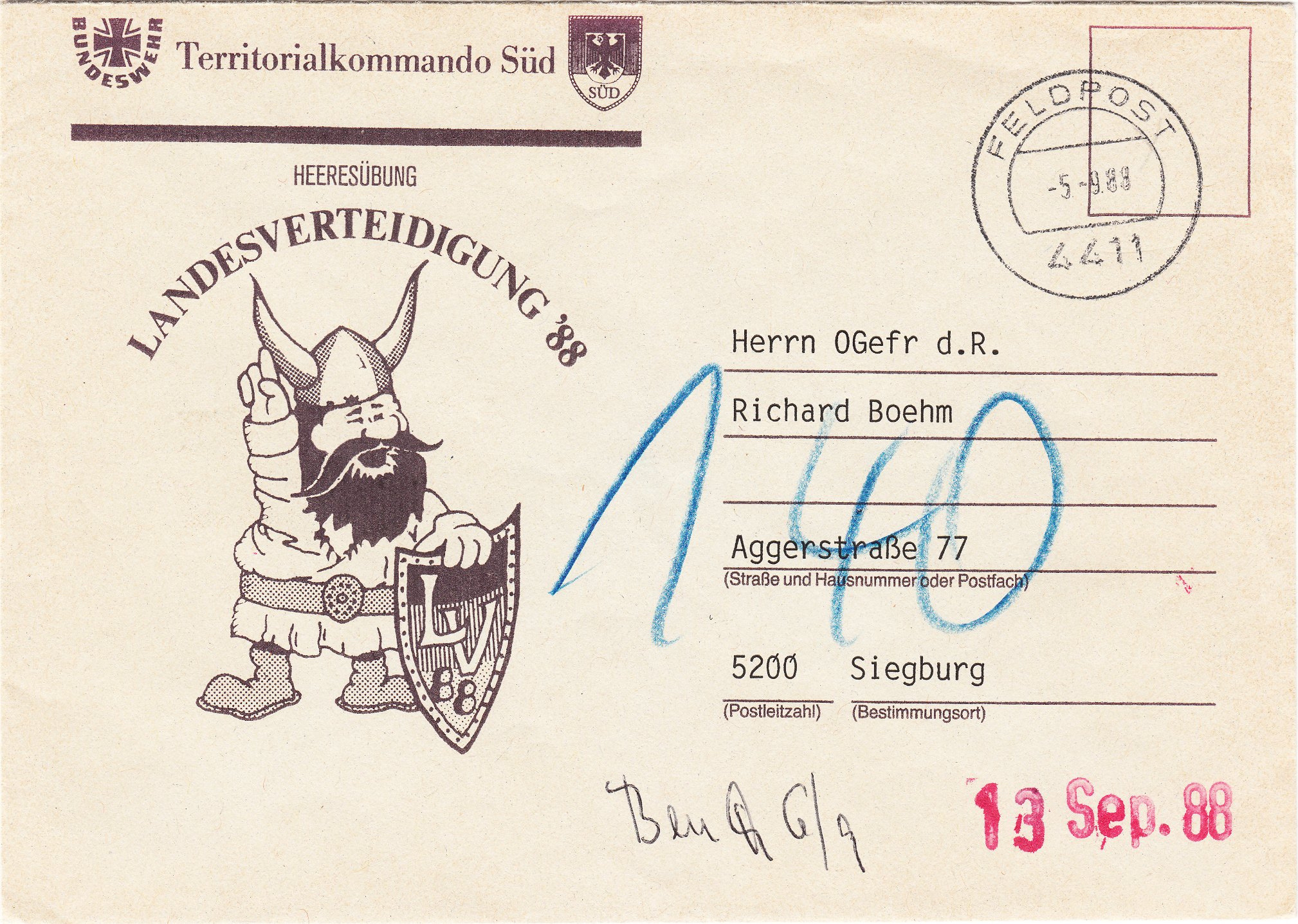 Die Übungsfeldpost war bei der Heeresübung Landesverteidigung '88 bereits vor der eigentlichen Übung vom 03.09.1988 bis zum 13.9.1988 tätig, der 14.9.1988 war Nachlauftag bis 12 Uhr.