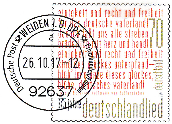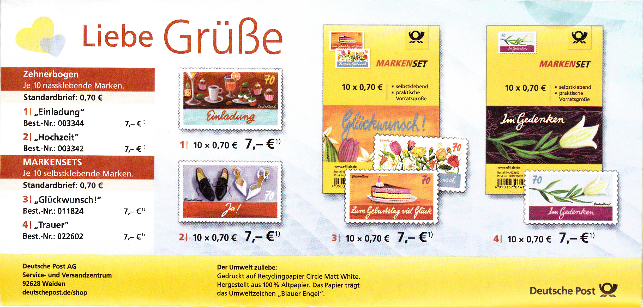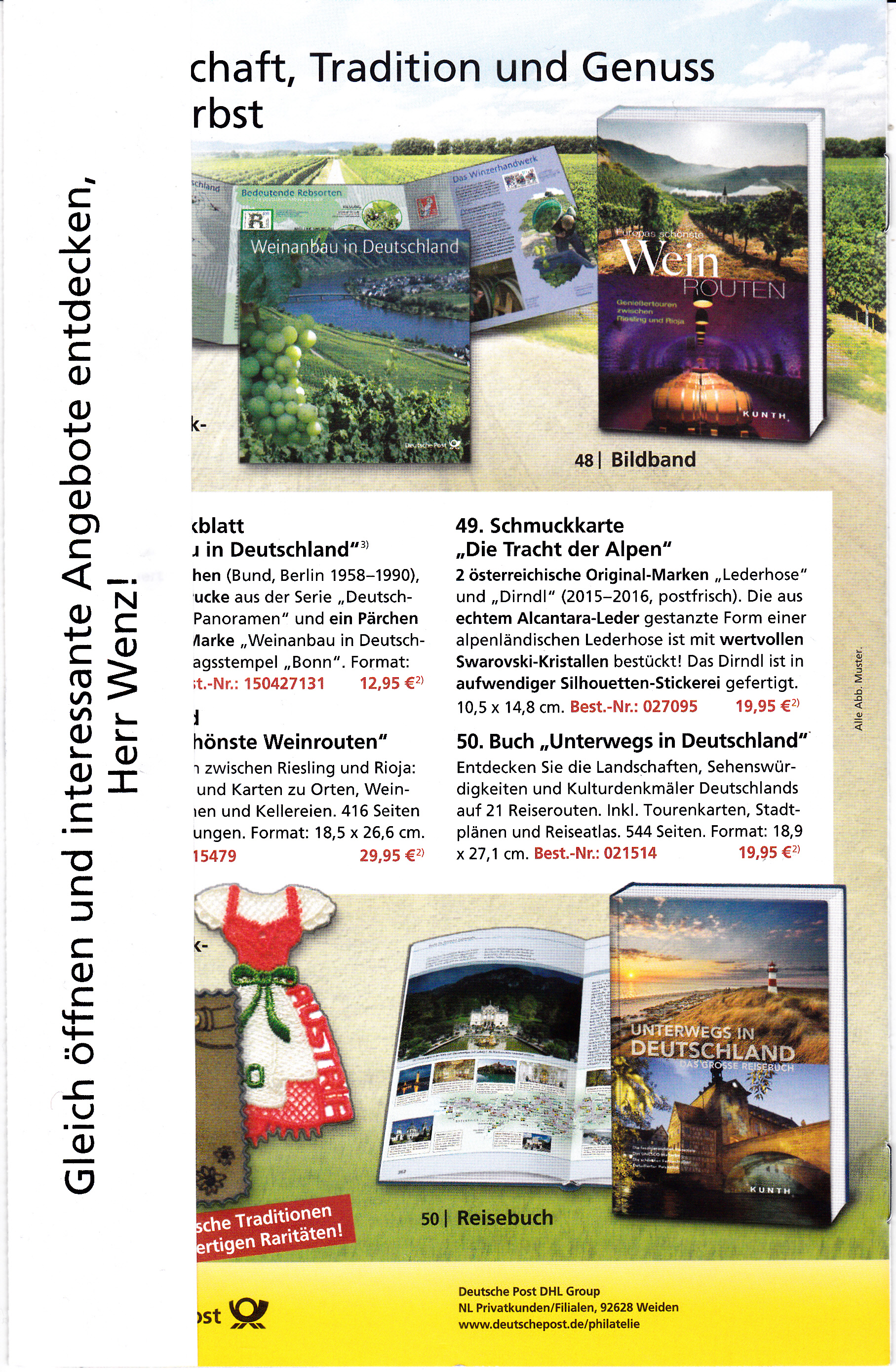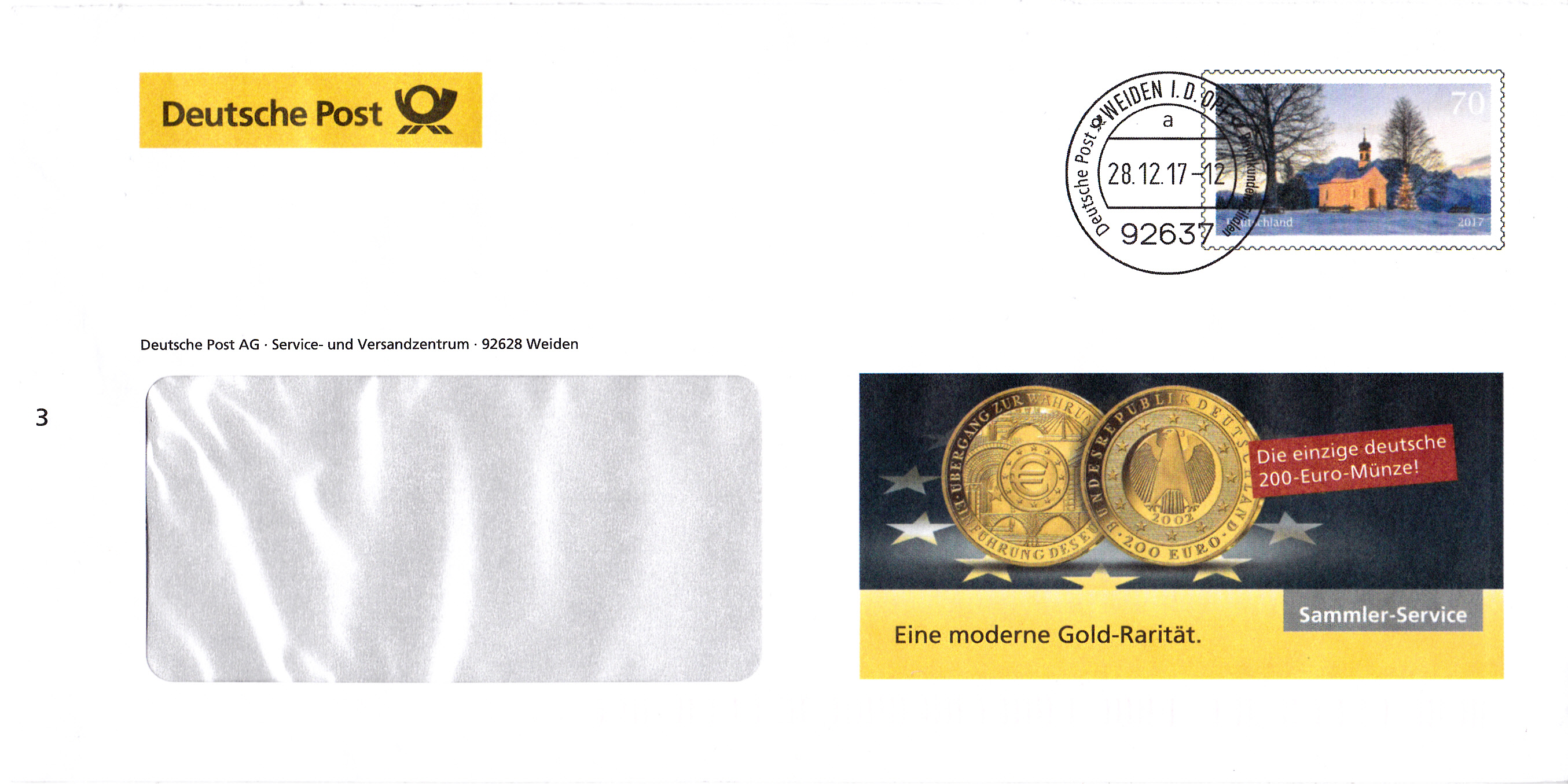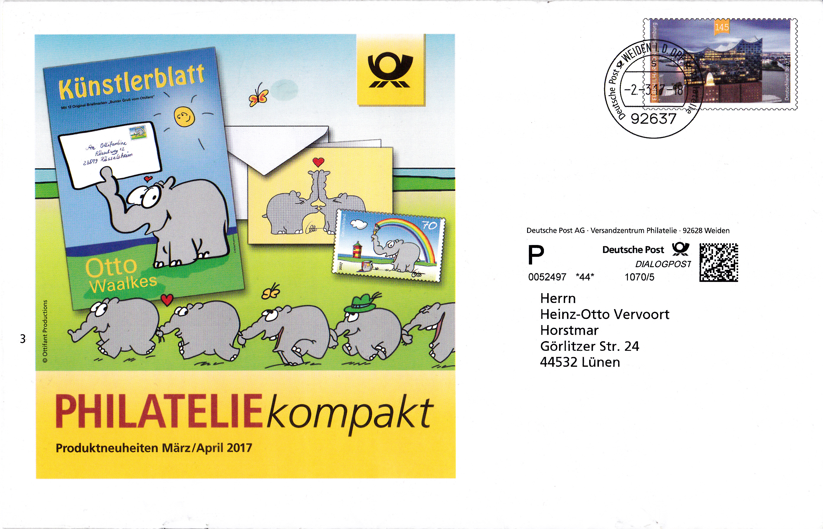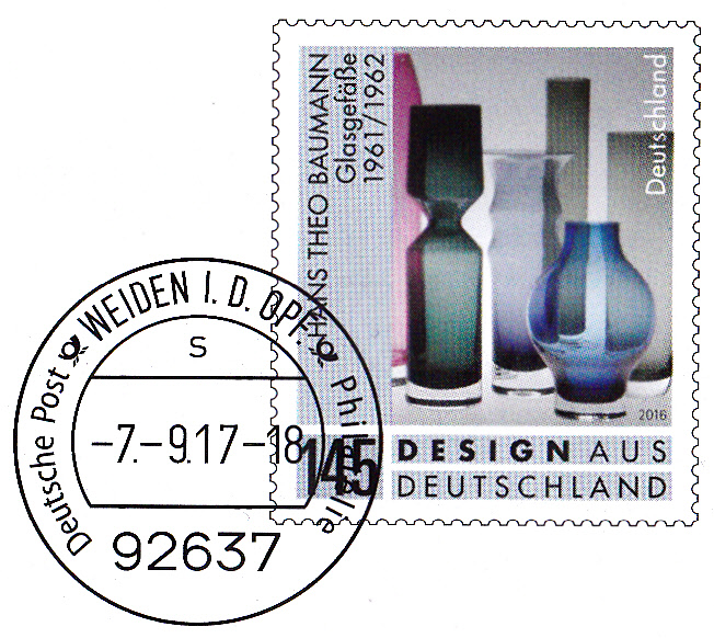 Diese Broschüre im Format 235 x 152 mm (unten geheftet) hat einen Wertstempel mit der 145 Cent Marke "Glasgefäße von Theo Baumann" (MiNr 3271) aus der Serie "Design aus Deutschland". Die Vorausentwertung hat das Datum "-7.-9.17". Obwohl dieser Umschlag vom Versandzentrum Philatelie stammt, trägt er nur das Postlogo - ohne den Zusatz Philatelie, wie sonst meist üblich.
