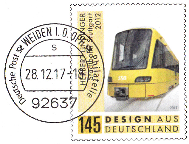 Dieser Umschlag im Format 229x162 mm hat einen Wertstempel mit der 145 Cent Marke "Stadtbahn Stuttgart von Herbert Lindinger" (MiNr 3349) aus der Bauerserie "Design aus Deutschland". Die Vorausentwertung hat das Datum "28.12.17-18".