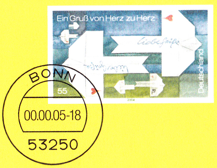 Ganzsachenumschlag (MiNr EA B25) im Format 229 x 114 mm mit einen Wertstempel der 70 Cent Marke "Ein Gruß von Herz zu Herz" (MiNr 2387). Die Vorausentwertung hat das Datum "00.00.05-18".