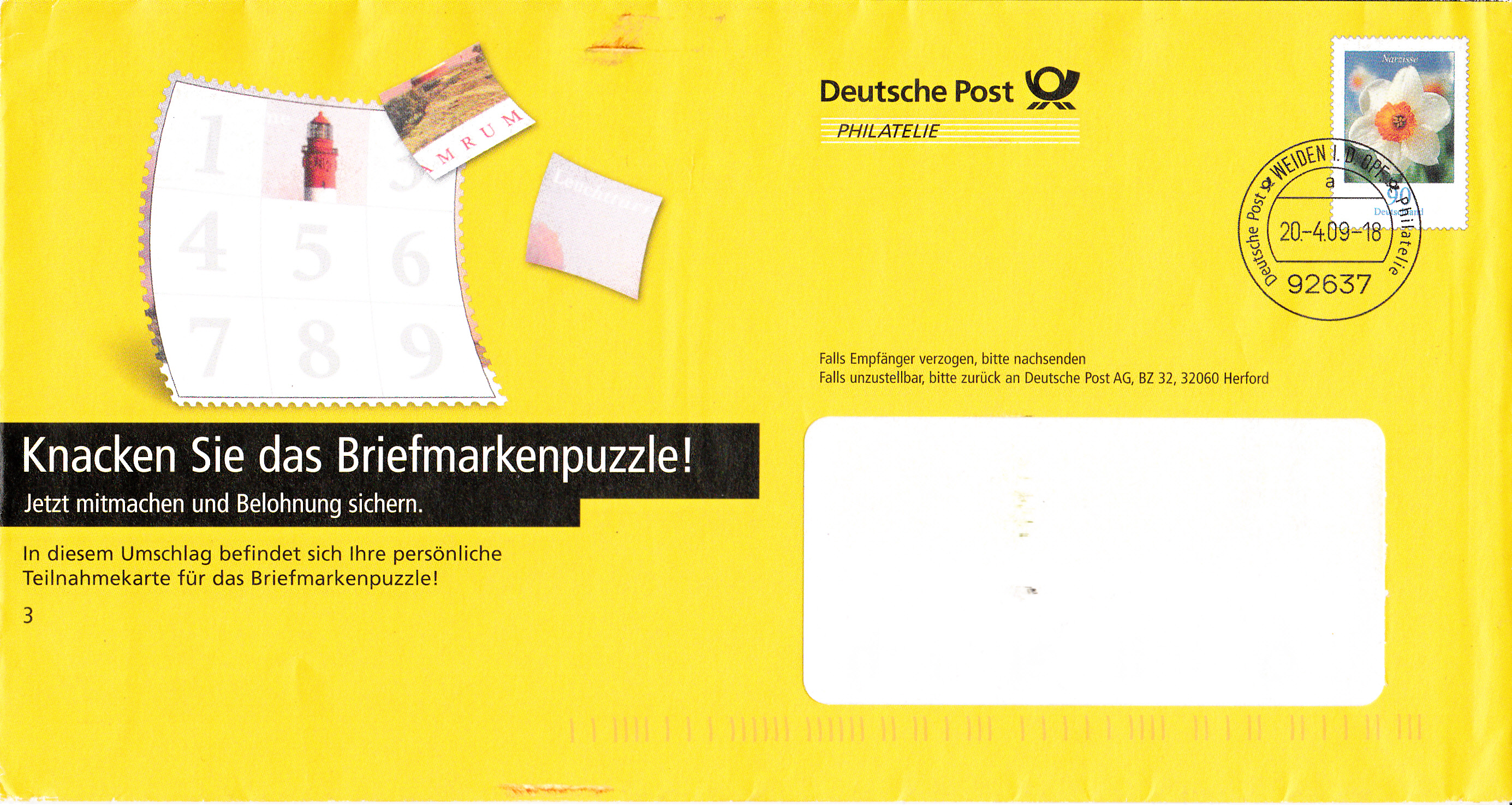 Dieser Ganzsachenumschlag (MiNr EA F427) im Format 235x125 mm hat einen Wertstempel mit der 90 Cent-Marke der Dauerserie "Blumen" (Narzisse, MiNr 2506). Die Vorausentwertung trägt das Datum "20.-4.09".