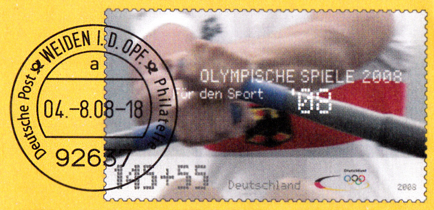 Ein weiterer Ganzsachenumschlag (MiNr EA F342) im Format 229x114 mm hat einen Wertstempel mit der 145+55 Cent-Marke "Olympische Spiele 2008, Rudern" (MiNr 2652) aus der Serie für die Sporthilfe 2008. Die Vorausentwertung trägt das Datum "-4.-8.08".