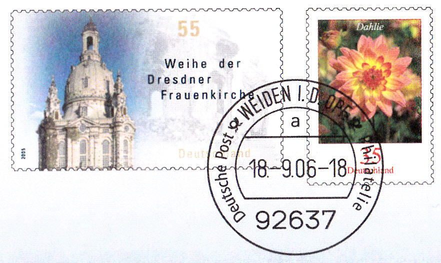 Dieser Ganzsachenumschlag (MiNr EA F160) im Format 229x114 mm hat zwei Wertstempel: die Sondermarke zur Weihe der Dresdner Frauenkirche (MiNr 2491) und den 35Pf-Wert der Dauerserie "Blumen" mit der Dahlie (MiNr 2505). Die Vorausentwertung trägt das Datum "18.-9.06".