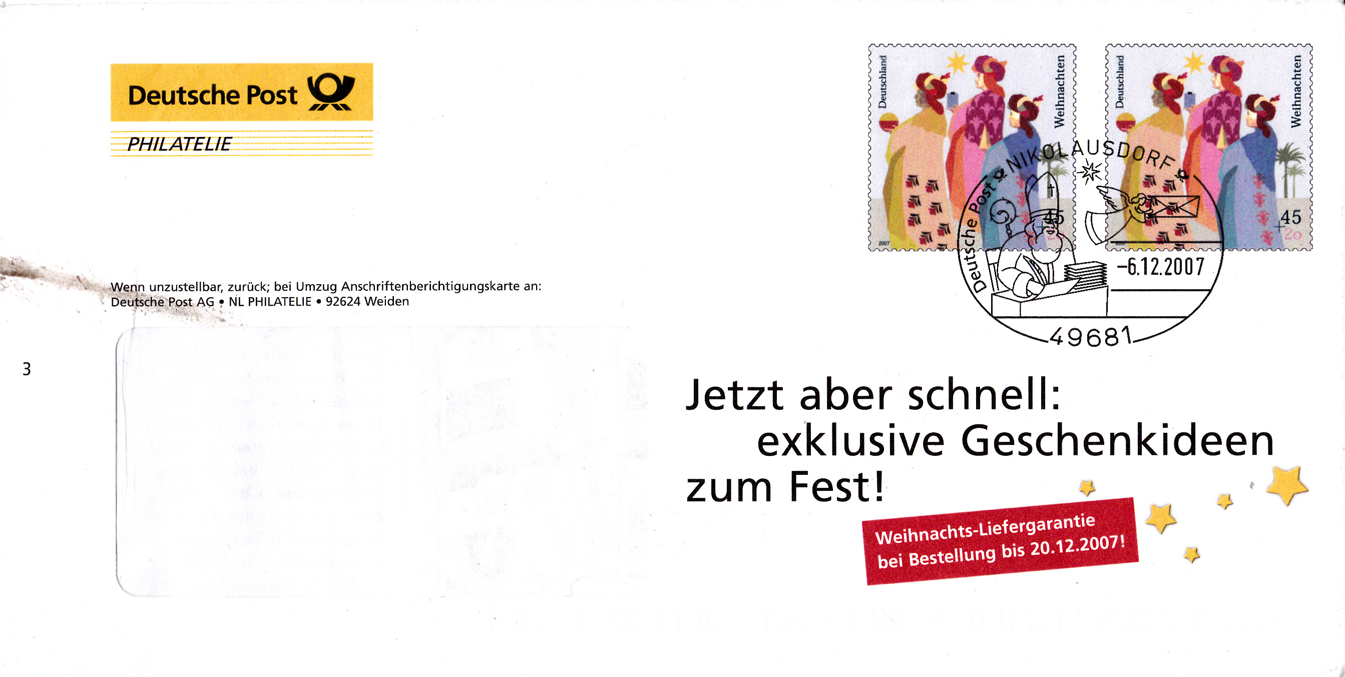 Ganzsachenumschlag im Format 229 x 114 mm (MiNr EA F269) mit zwei Wertstempel der 45+25 Cent Marke "Weihnachten" 2007 (MiNr 2626). Die Vorausentwertung mit dem Sonderstempel "49681 Nikolausdorf" hat das Datum "-6.12.2007".