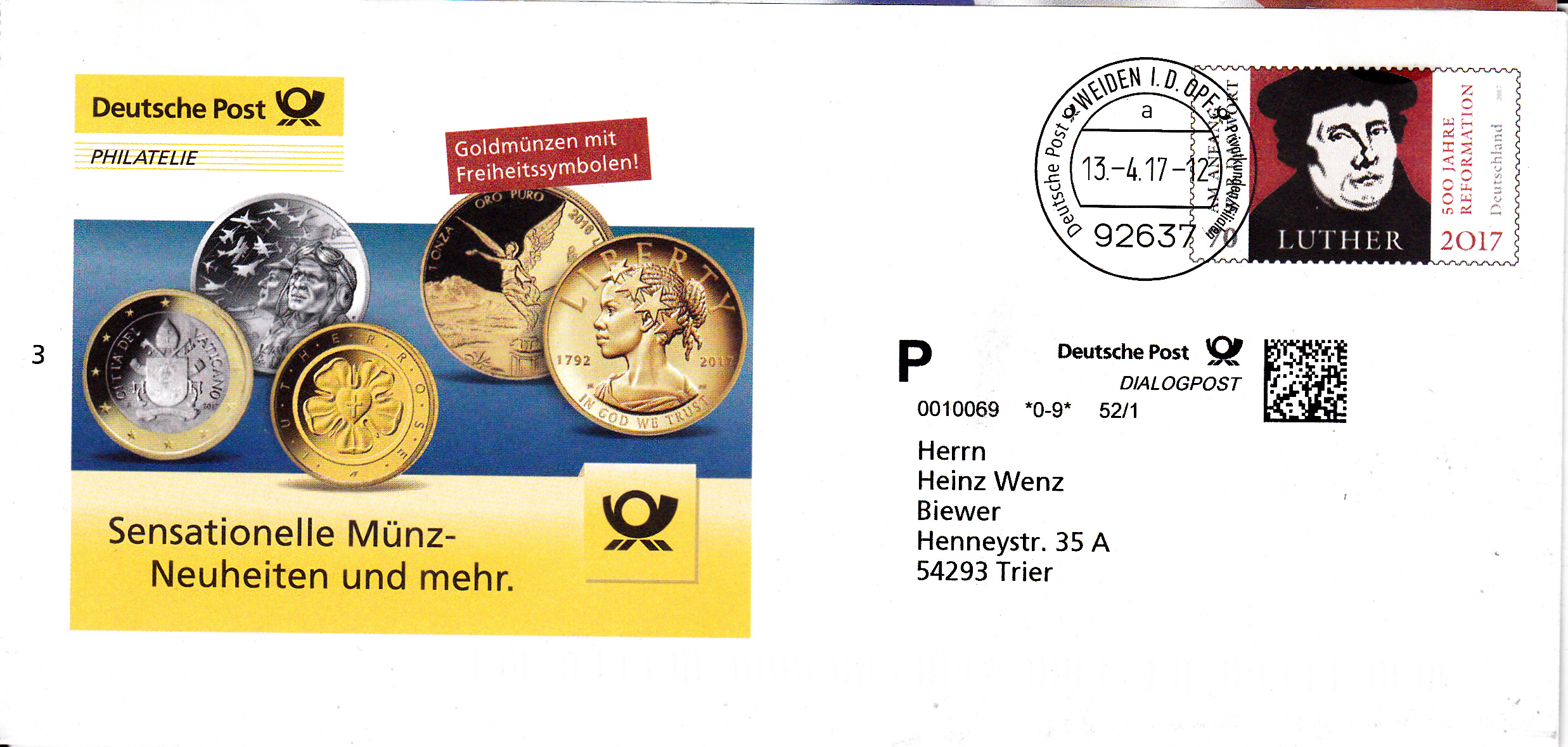 Faltbrief 210 mm x 102 mm mit Wertstempel der 70C-Marke " 500. Jahrestag der Reformation" (MiNr 3300) mit aufgedruckter Zähnung und Vorausentwertung "Deutsche Post (Posthorn) WEIDEN I.D.OPF (Posthorn) Privatkunden/Filialen / a / -3.-4.17-12". Bei dieser Eigenausgabe ist interessant, dass das Vorausentwertungsdatum 3.4.17 vor dem Ausgabetag der eigentlichen Marke (13.4.2017) liegt. Offensichtlich wurde bei der Datumsangabe die "1" der "13" vergessen.