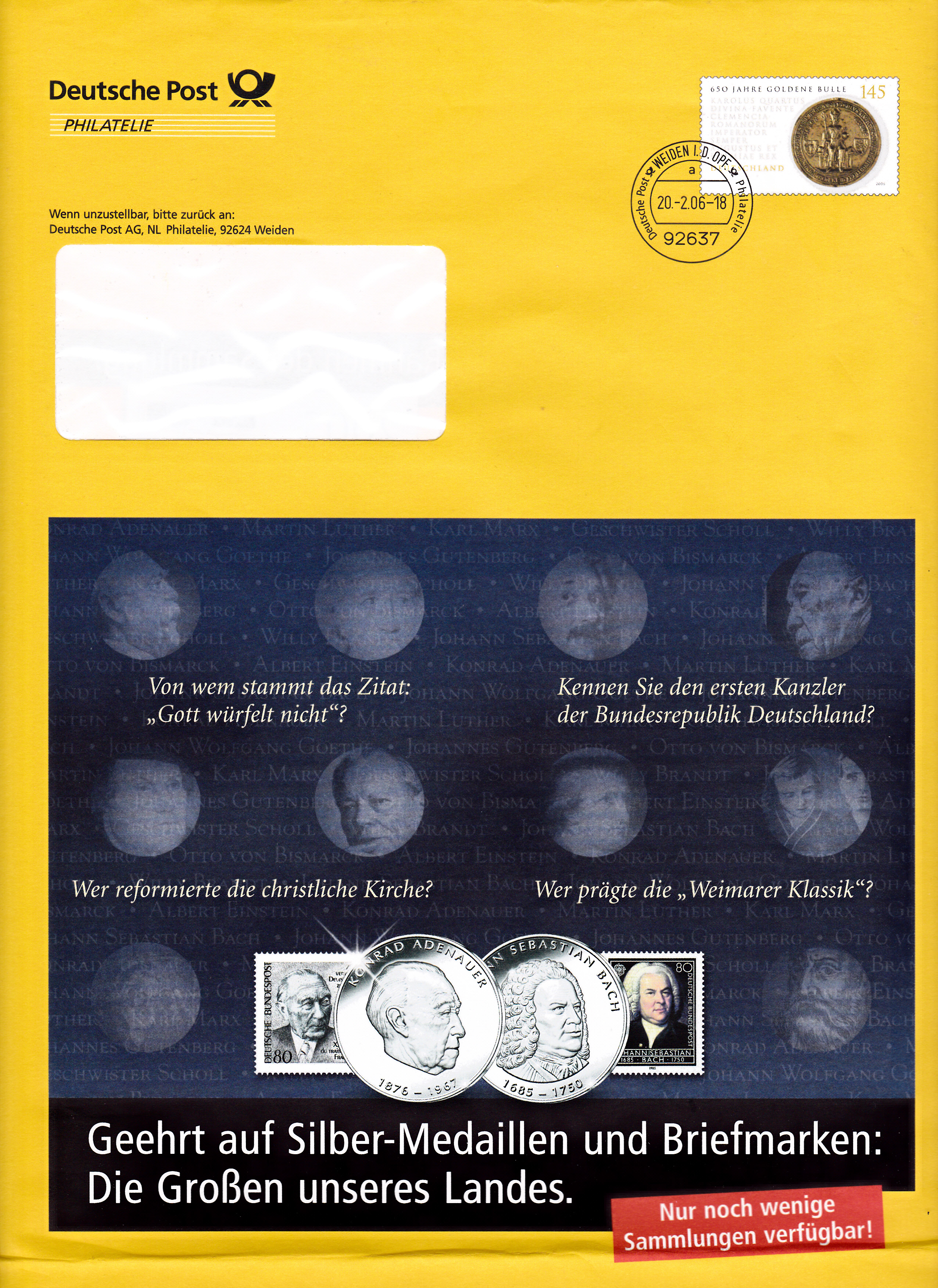 Dieser Ganzsachenumschlag im Format 229 x 324 mm hat einen Wertstempel mit der 145 Cent Marke "450 Jahre Goldene Bulle" (MiNr 2511). Die Vorausentwertung hat das Datum "20.-2.06". Der Umschlag ist unter der MiNr EA F124 katalogisiert. Der Scan erfasst nicht den gesamten Umschlag, da zu groß für die DIN A4 Scan-Fläche.