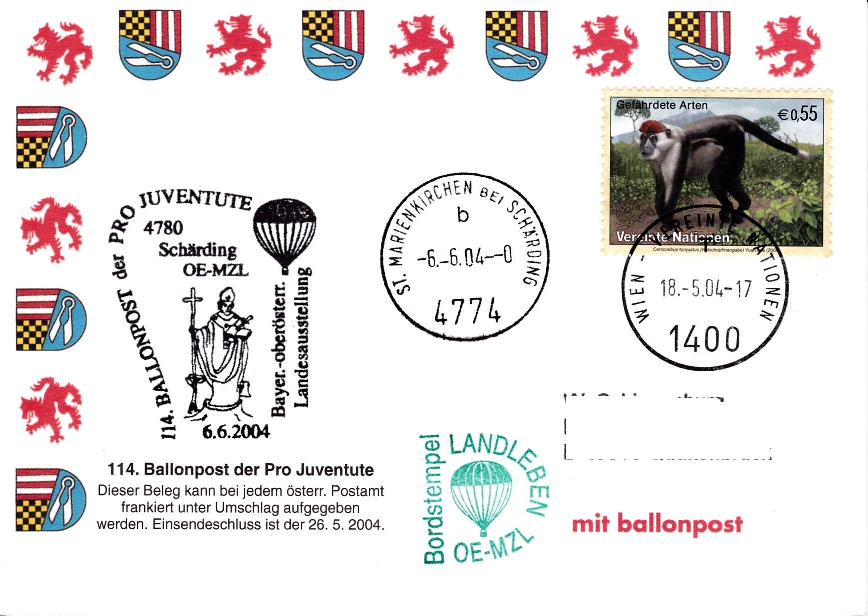Diese Karte wurde am 18.5.2004 für den 114. Ballonpostflug der Österreichischen Pro Juventute mit dem Freiballon OE-MZL in Schärding beim UNO-Postamt in Wien aufgegeben. Die zur Frankatur verwendete Marke der UNO-Postverwaltung Wien wurde mit einem Tagesstempel Wien - Vereinte Nationen gestempelt. Am 6.6.2004 erhielt die Karte den Sonderstempel aus Schärding zu diesem 114. Ballonpostflug. Zusätzlich wurde ein Tagesstempel aus Suben und ein Bordstempel auf dem Umschlag angebracht.